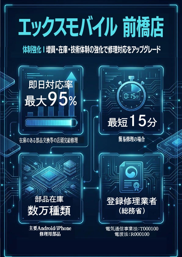 株式会社リュウセンパートナーズ(本社:東京都千代田区、代表取締役:立川 耕三)は、「エックスモバイル 前橋店(所在地:群馬県前橋市千代田町3丁目1-20)」にてスタッフ増員と部品在庫体制を強化し、Android・iPhoneの両方で、基板修理を含む高難易度修理まで修理相談の対応範囲を拡大しました。