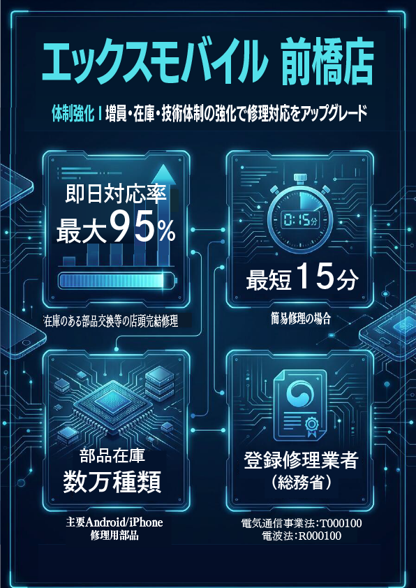 株式会社リュウセンパートナーズ(本社:東京都千代田区、代表取締役:立川 耕三)は、「エックスモバイル 前橋店(所在地:群馬県前橋市千代田町3丁目1-20)」にてスタッフ増員と部品在庫体制を強化し、Android・iPhoneの両方で、基板修理を含む高難易度修理まで修理相談の対応範囲を拡大しました。