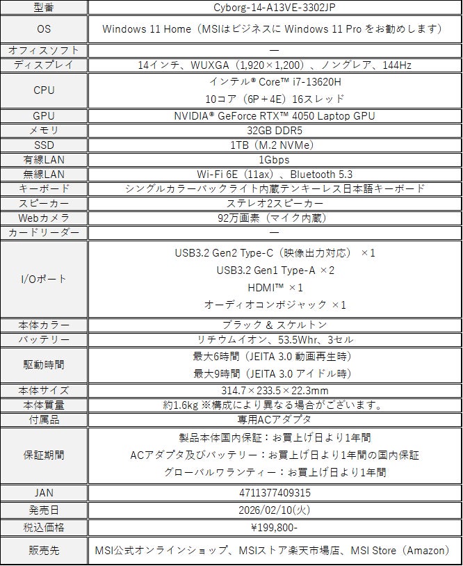 この度、エムエスアイコンピュータージャパン株式会社は、「Core i7」「RTX 4050」「14インチ 144Hz ディスプレイ」 の組み合わせにより、ゲーミングからクリエイティブ作業・マルチメディア用途までパワフルかつ快適にこなせる14インチ・ハイスペックゲーミングノートPC「Cyborg-14-A13VE-3302JP」 を2026年2月10日(火)より順次販売開始 いたします。