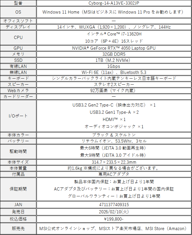 この度、エムエスアイコンピュータージャパン株式会社は、「Core i7」「RTX 4050」「14インチ 144Hz ディスプレイ」 の組み合わせにより、ゲーミングからクリエイティブ作業・マルチメディア用途までパワフルかつ快適にこなせる14インチ・ハイスペックゲーミングノートPC「Cyborg-14-A13VE-3302JP」 を2026年2月10日(火)より順次販売開始 いたします。