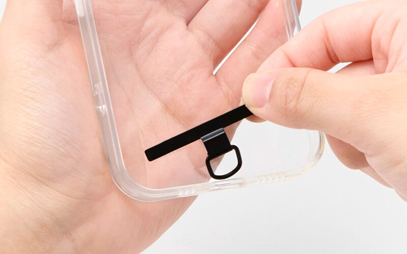 • ケースにストラップホールがなくても、付属のストラップホールシートをスマートフォンとケースの間に挟むだけで使用できます。