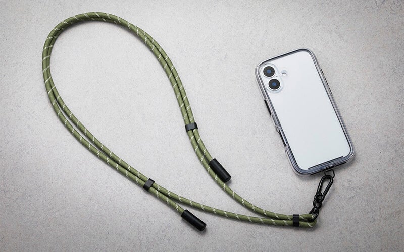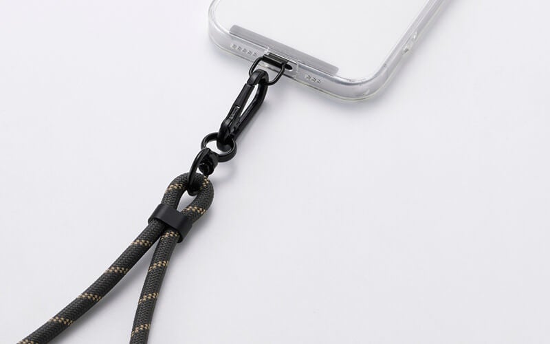 ショルダーストラップがUSB Type-C(TM)(USB-C(TM))ポート対応の充電ケーブルに早変わりする“2in1”仕様のストラップです。直径約6mmの丸ひもを採用し、日常使いでも肩が疲れにくい軽量スリム設計にしました。スマートフォンケースにストラップホールがない場合でも、高耐久のステンレス製シートを挟み込むことで使用できます。ストラップの長さは最大1.5mまで調整可能です。ストラップの両端にはキャップ付きのUSB Type-C(TM)コネクターを備え、AC充電器やモバイルバッテリーと組み合わせることでスマートフォンを充電できます(最大60W・20V/3A)。カラーは服装やシーンを選ばず使えるアースカラーの4色をご用意しました。
