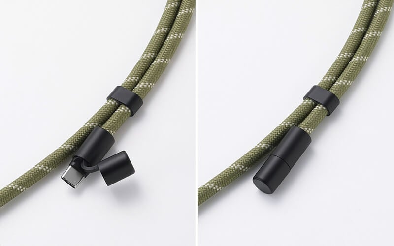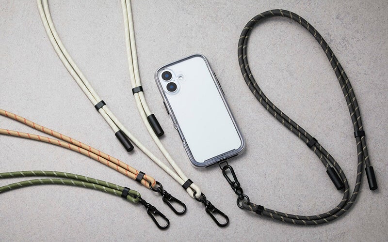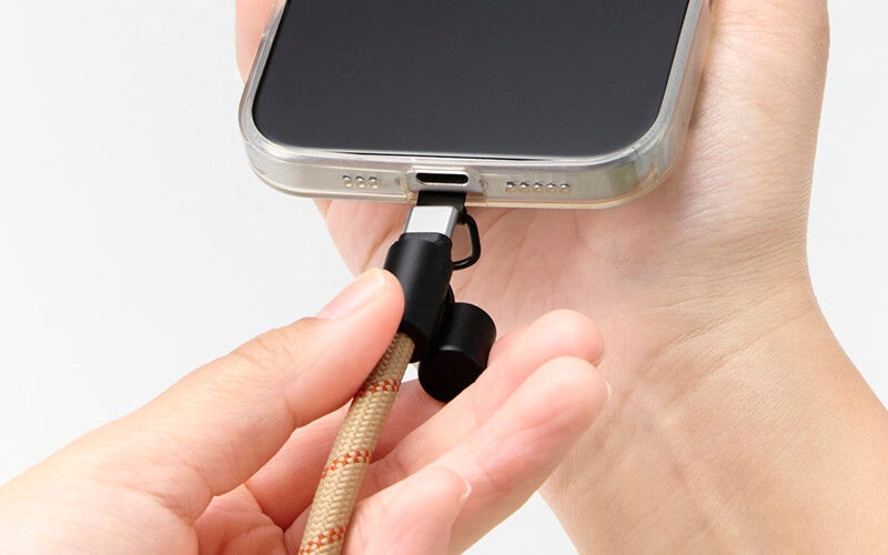 ショルダーストラップがUSB Type-C(TM)(USB-C(TM))ポート対応の充電ケーブルに早変わりする“2in1”仕様のストラップです。直径約6mmの丸ひもを採用し、日常使いでも肩が疲れにくい軽量スリム設計にしました。スマートフォンケースにストラップホールがない場合でも、高耐久のステンレス製シートを挟み込むことで使用できます。ストラップの長さは最大1.5mまで調整可能です。ストラップの両端にはキャップ付きのUSB Type-C(TM)コネクターを備え、AC充電器やモバイルバッテリーと組み合わせることでスマートフォンを充電できます(最大60W・20V/3A)。カラーは服装やシーンを選ばず使えるアースカラーの4色をご用意しました。