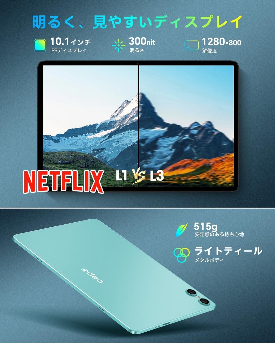 【見やすいディスプレイ:10.1インチ IPS + Widevine L1 Netflix対応】 Android タブレット wi-fiモデルは、10.1インチのIPSスクリーンを搭載し、1280×800の解像度と16:10の黄金比で見やすさを追求しました。タブレット 10インチは映画鑑賞や動画視聴に最適で、Widevine L1認証によりNetflixなどのHDコンテンツも安心して再生可能です。
