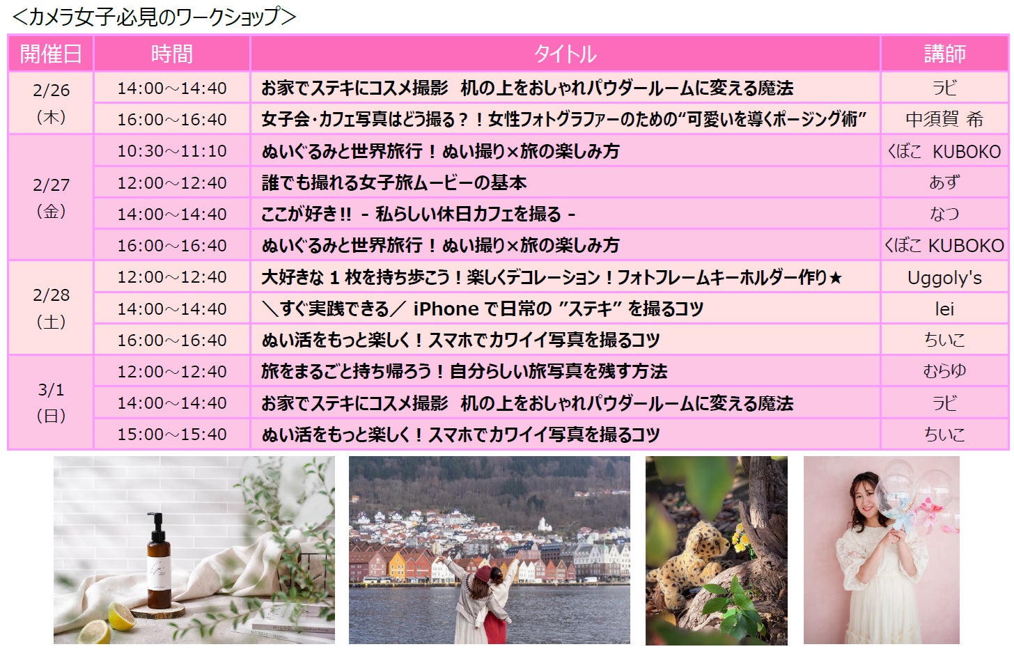 カメラ女子やファミリーのビジュアルライフを彩る、体験型ワークショップを多数ラインナップ。「もっとかわいく、もっとオシャレに」。撮りたい気持ちに応え、撮影の楽しみを広げませんか。