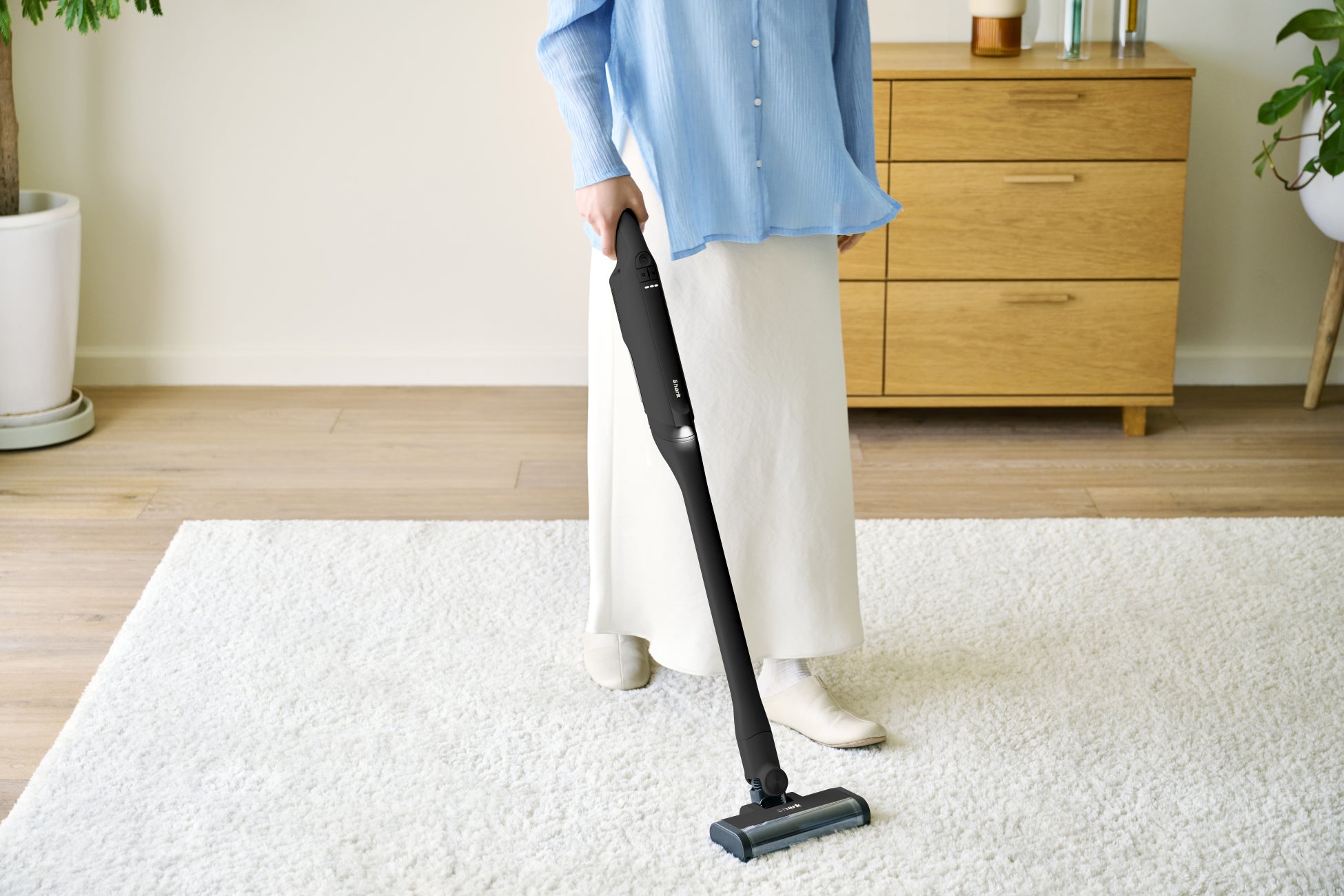 Sharkハンディクリーナーとして初めてアクセサリーに「フロア用電動ノズル」を付属(※8)し、床掃除もハンディクリーナーでの掃除もこれ1台で可能になりました。これまでもハンディクリーナーに取りつけてちょっとした床掃除もできる「フローリング用延長ノズル」はありましたが、新登場の電動ノズルはカーペットやラグなどにも対応し、コンパクトで小回りの利くヘッドでさらに床の掃除がしやすくなりました。「フロア用電動ノズル」装着時は約1.2kgなので、部屋間の移動も軽々できます。