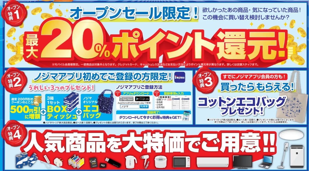 また、2月13日(金)~3月6日(金)の期間中、オープン限定特価としてノジマポイントが最大20%還元になるお得なセールも開催いたします。皆さまのご来店をお待ちしております!