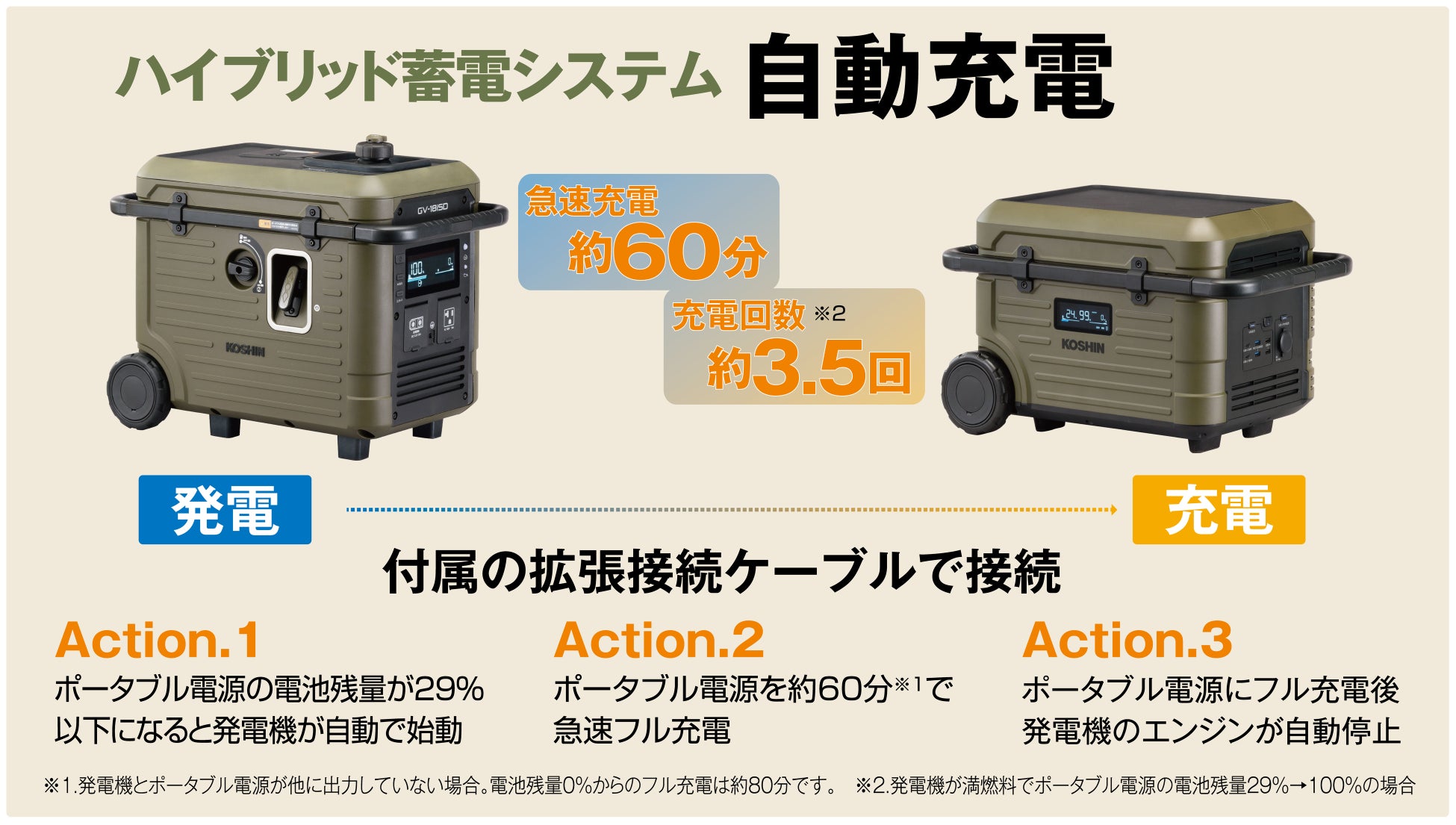 また、発電機を接続してポータブル電源を充電する場合、約 1時間で充電することが可能です。 (AC-100Vで充電する場合は約 2時間)