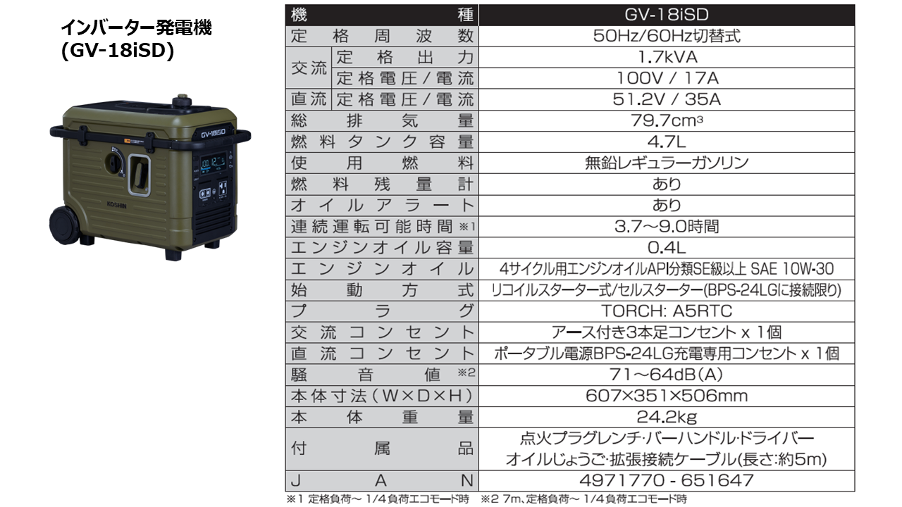 2.15kWh〕=約 5時間、満燃料の発電機(GV-18iSD)から満充電のポータブル電源