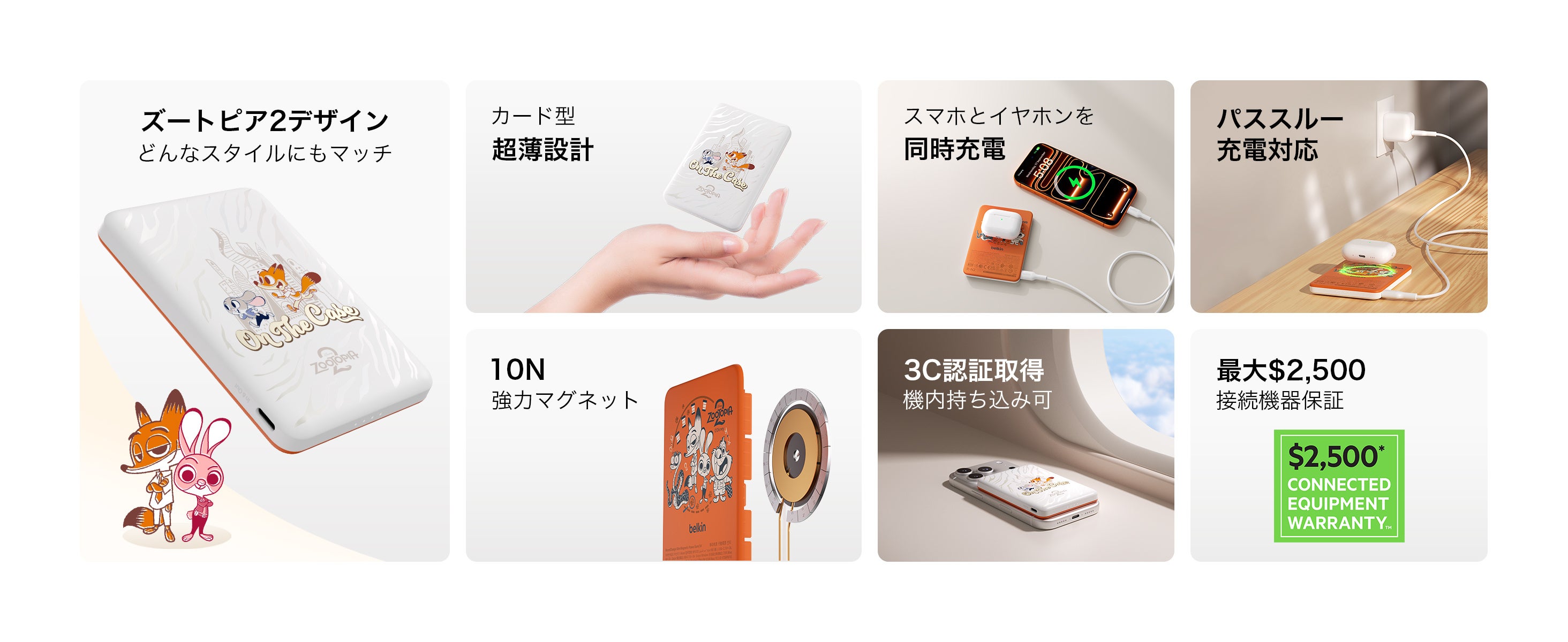 本製品は、ディズニー映画『ズートピア2』の人気コンビ、ニック&ジュディをあしらった限定デザインと、Belkinの高度な電源技術を融合させた5,000mAh超薄型マグネット式モバイルバッテリーです。ホワイトとオレンジの鮮やかなバイカラーに、キュートなモチーフプリントを施した存在感抜群のデザインが、毎日の充電タイムを楽しく彩ります。