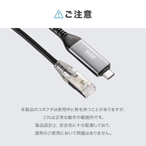 USB Type-CポートをLAN(RJ-45)ポートへ変換できるケーブルです。変換アダプタを別途用意する必要がなく、ケーブル1本でスマートに有線接続が可能。LANポート非搭載のノートPCや薄型モバイルPCでも、オフィスや自宅の有線ネットワークにすぐ接続できます。デスク周りもすっきりし、持ち運び用としても便利です。