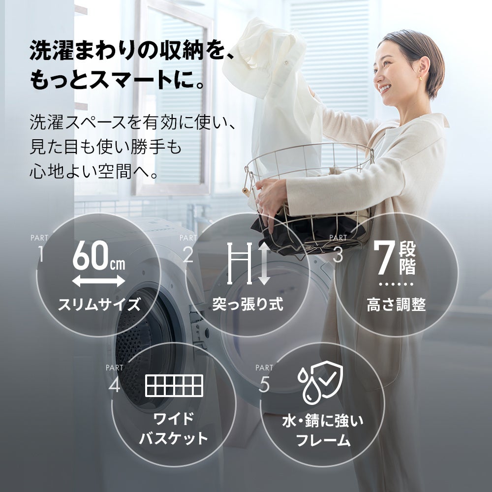 洗濯機の横のような少ないスペースでも設置できる25.5cm×60cmのバスケット付き伸縮ランドリーラックを新発売。