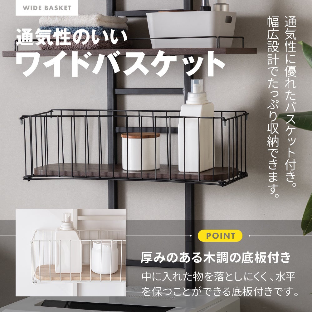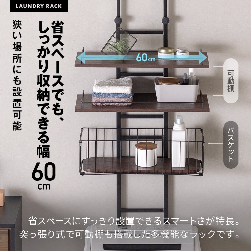 洗濯機の横のような少ないスペースでも設置できる25.5cm×60cmのバスケット付き伸縮ランドリーラックを新発売。