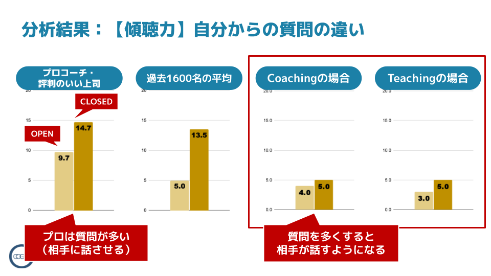 なお、過去1600名の平均データにはコーチング訓練を受けた人のデータも含まれるため、コーチング未経験者のデータと比較した場合には差が現れやすい点に留意が必要です。