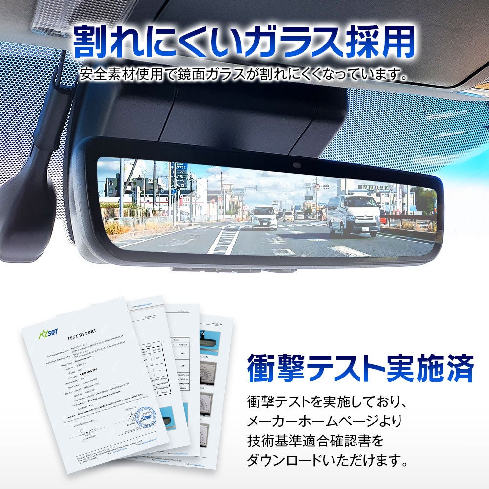 9.6インチの逆台形モニターはミラー幅:約25cmと純正品と変わらないサイズ感、スタイリッシュな外観で純正ミラーと交換しても違和感がありません。