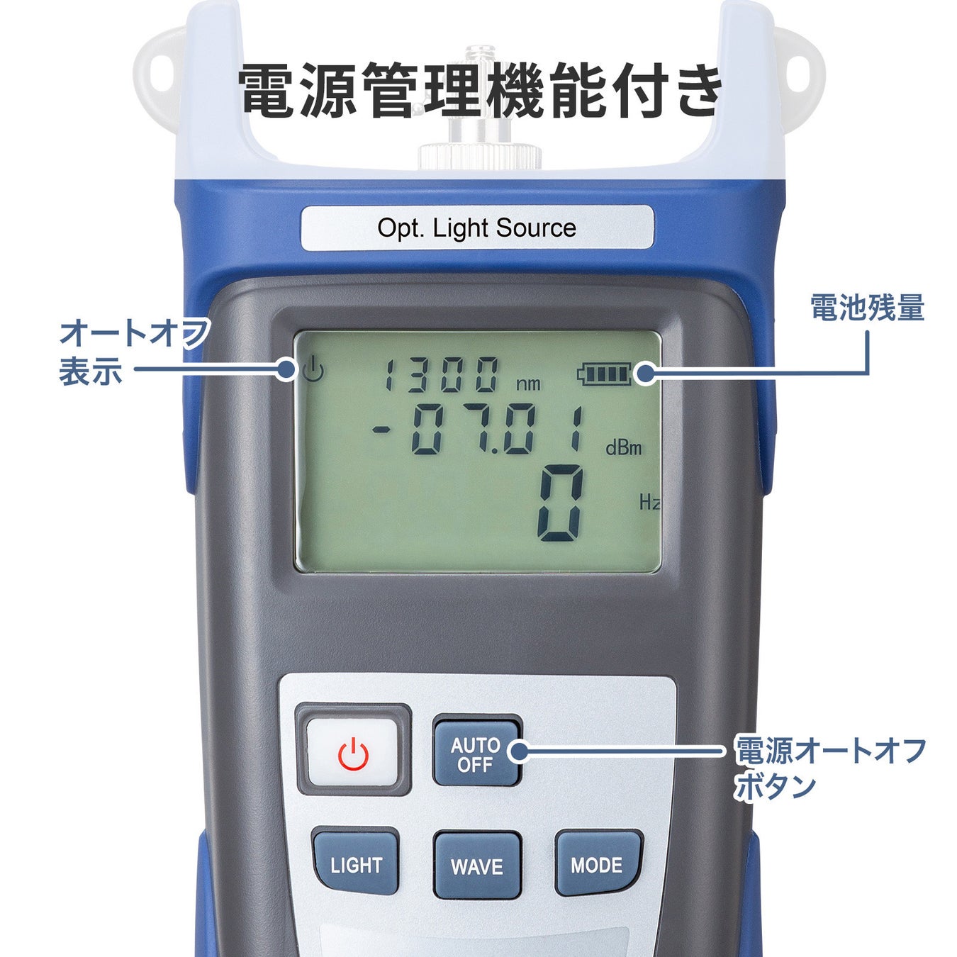 オートパワーオフ機能のON・OFFの切り替えができ、電池残量表示付機能がついています。