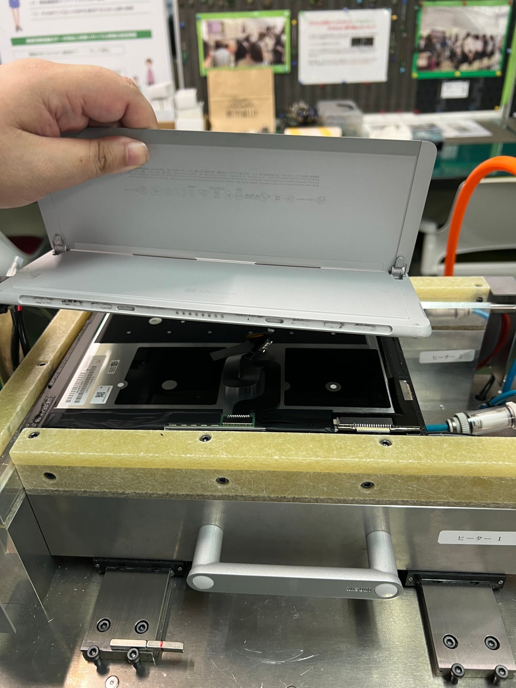 ●発生タイミング: 分解工程の液晶部(ディスプレイ)分離時がピーク。真空吸着パッドによる固定、ヒーター加熱(約100℃で接着剤軟化)、レバー引き上げ時の振動・圧力変化がトリガー。