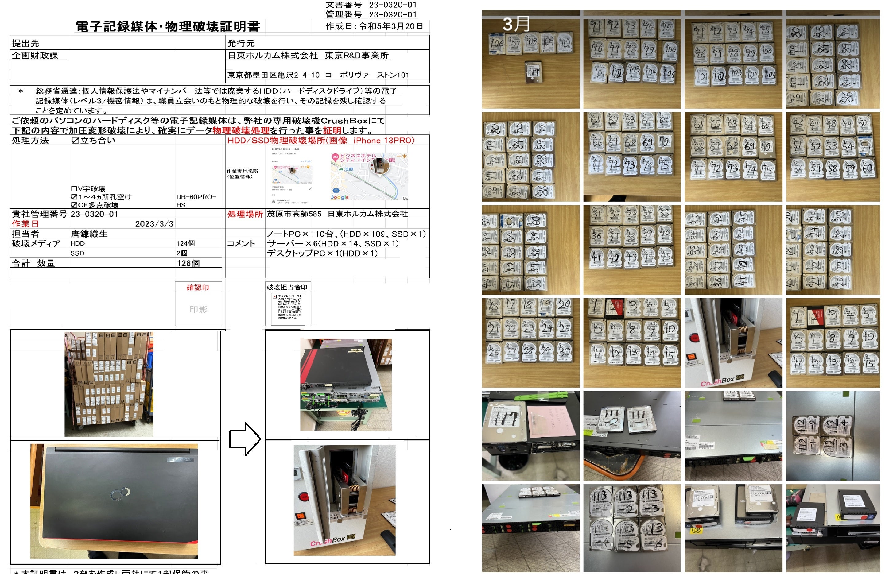 ●破壊工程:CrushBoxシリーズ(DB-80SSDなど)と連携し、eMMC/SSDを2mm角以下に微細粉砕(NSA/NIST/DIN66399準拠、15秒サイクル) 証明書発行:資産管理番号紐づけの個別証明書(復活有無・破壊前後ログ・デジタルフォレンジック対応、改ざん防止クラウド保管)