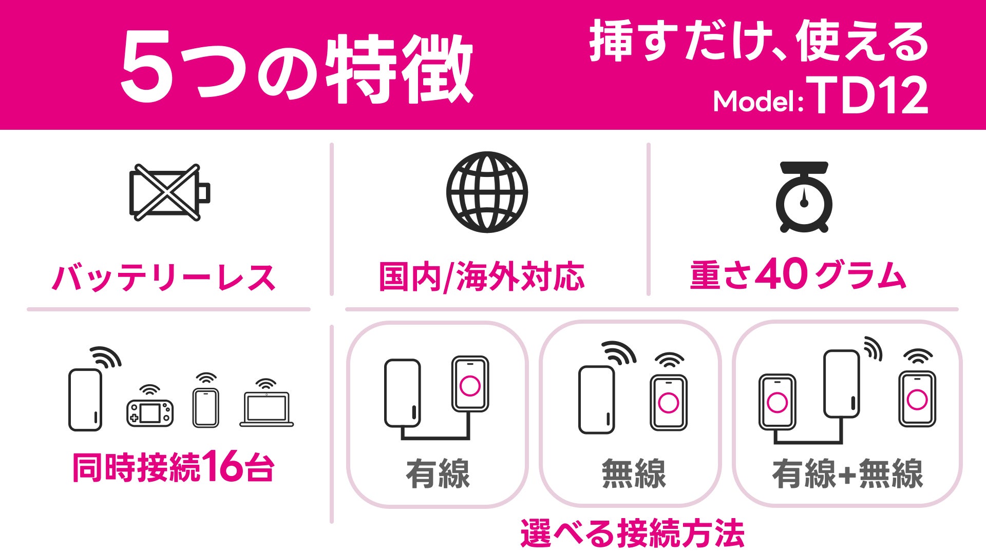 【リチャージWiFi】車載Wi-Fiが進化! 挿すだけで使える(国内海外対応) バッテリーレスモデル(TD12)が新登場!