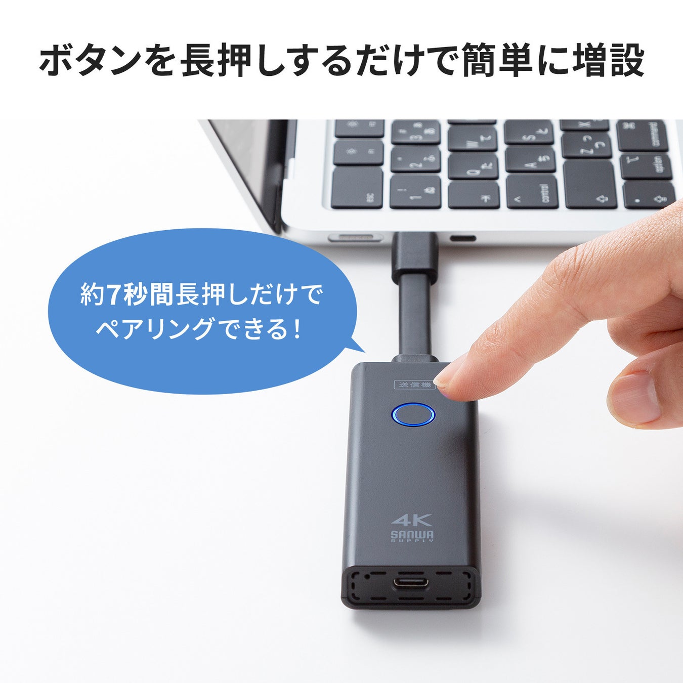 サンワサプライ株式会社(本社:岡山市北区田町1-10-1、代表取締役社長 山田和範)は、4K映像をワイヤレスで伝送できるHDMIエクステンダー「VGA-EXWHD12CSET(Type-C送信機)」「VGA-EXWHD12SET(HDMI送信機)」と、専用収納ボックス「VGA-EXWHDBOX」を発売しました。送信機と受信機はペアリング済みで、接続するだけですぐにワイヤレス化が可能です。会議など、複数名の映像を切り替えて表示したい場合に最適です。
