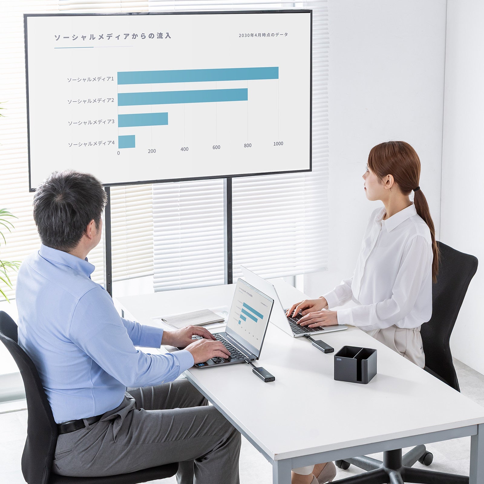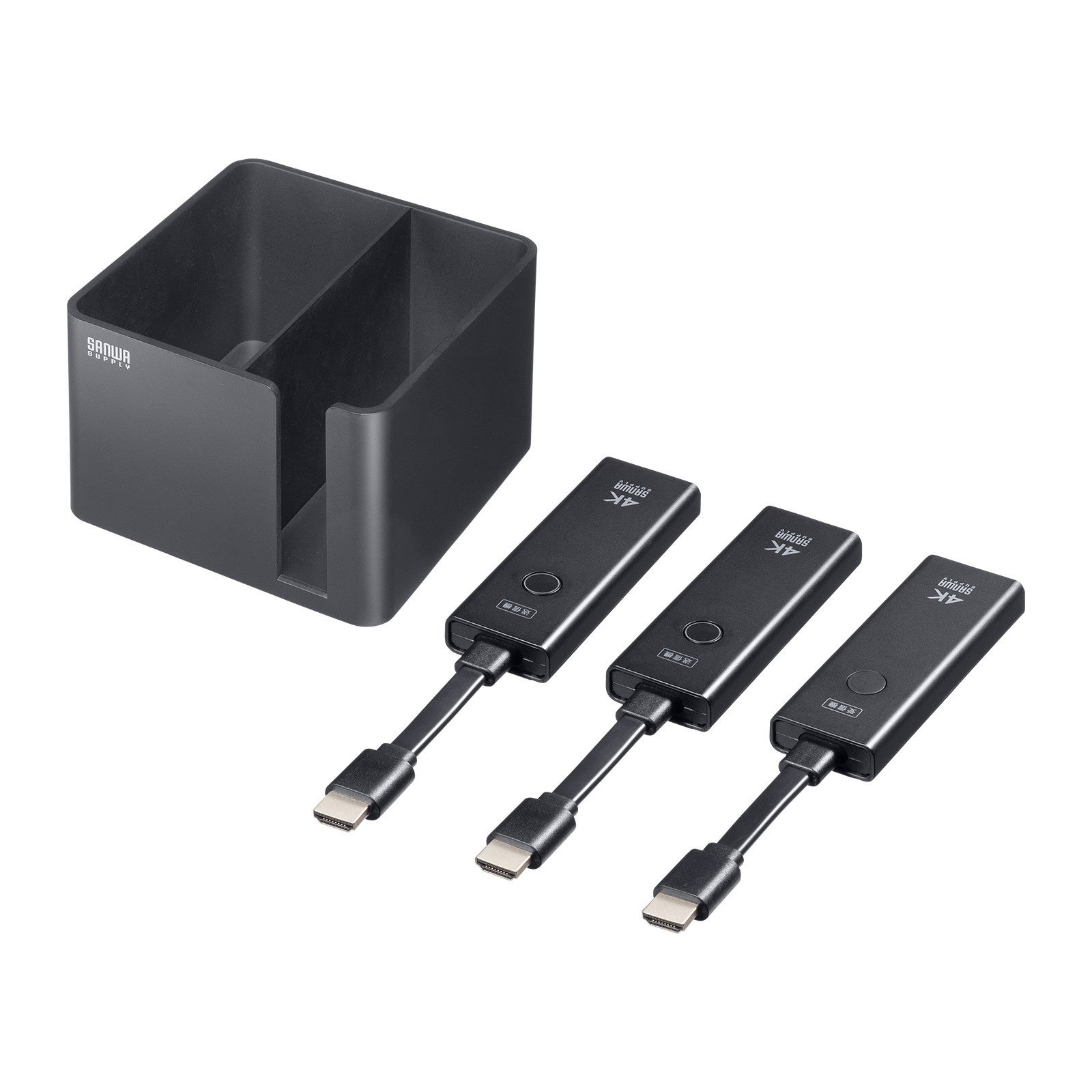 サンワサプライ株式会社(本社:岡山市北区田町1-10-1、代表取締役社長 山田和範)は、4K映像をワイヤレスで伝送できるHDMIエクステンダー「VGA-EXWHD12CSET(Type-C送信機)」「VGA-EXWHD12SET(HDMI送信機)」と、専用収納ボックス「VGA-EXWHDBOX」を発売しました。送信機と受信機はペアリング済みで、接続するだけですぐにワイヤレス化が可能です。会議など、複数名の映像を切り替えて表示したい場合に最適です。