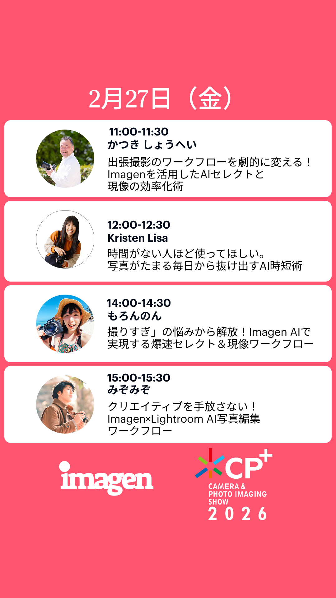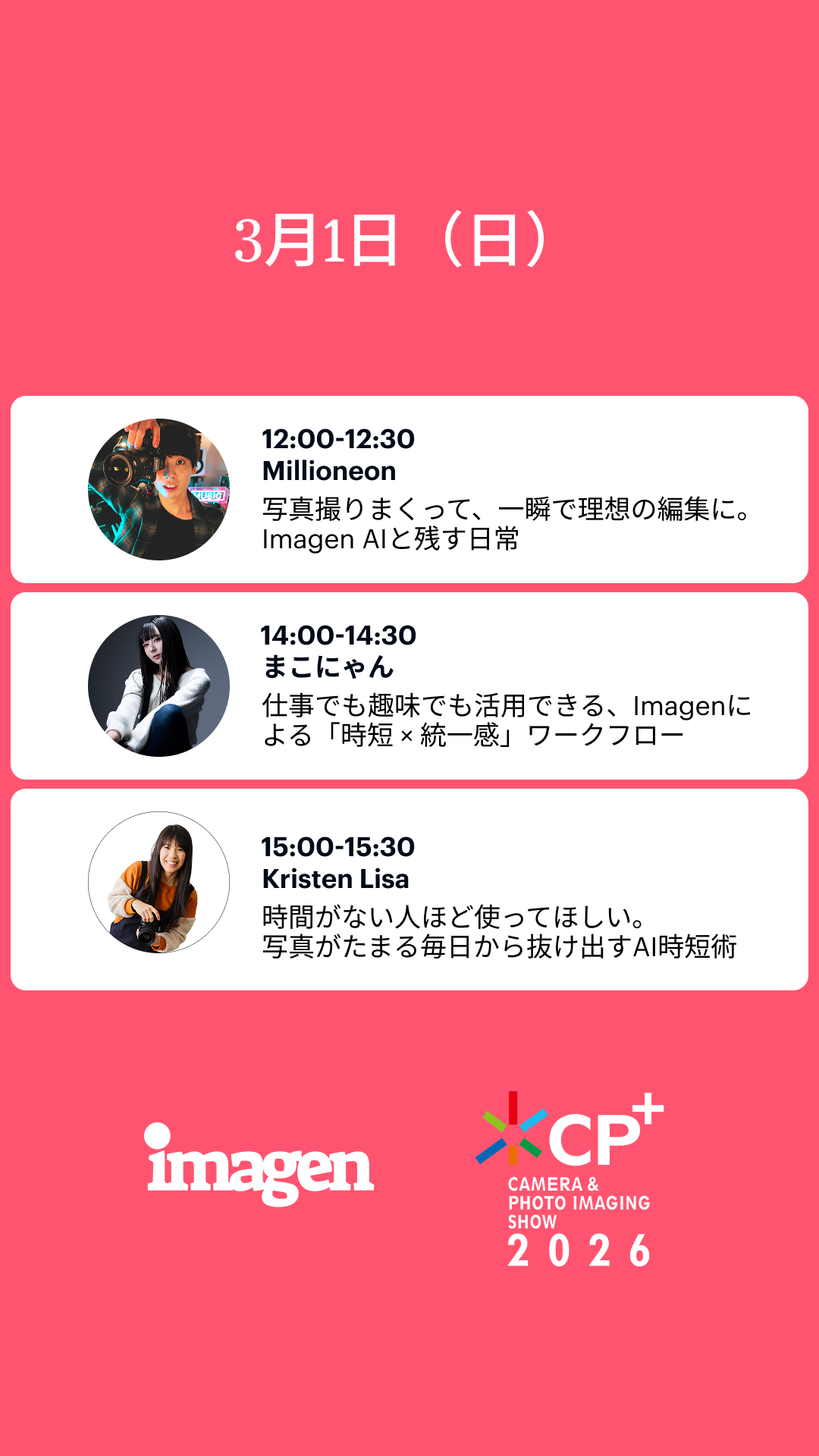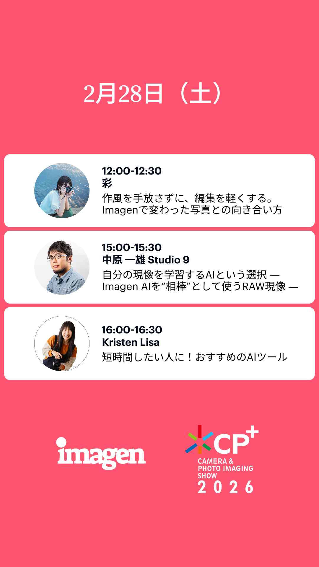 これらの新機能は、CP+会場内Imagenブース(ブース番号:40)にて体験いただけます。