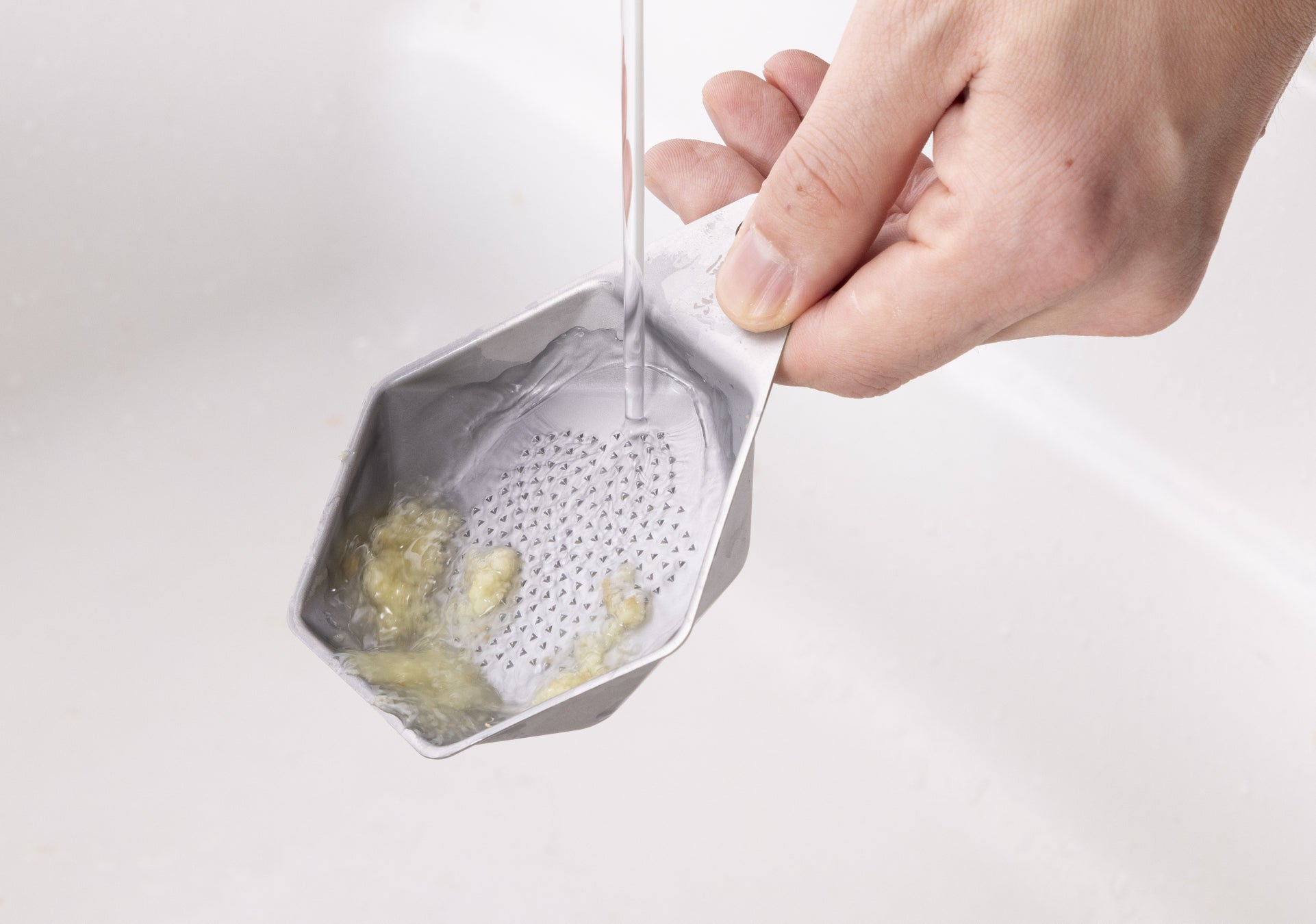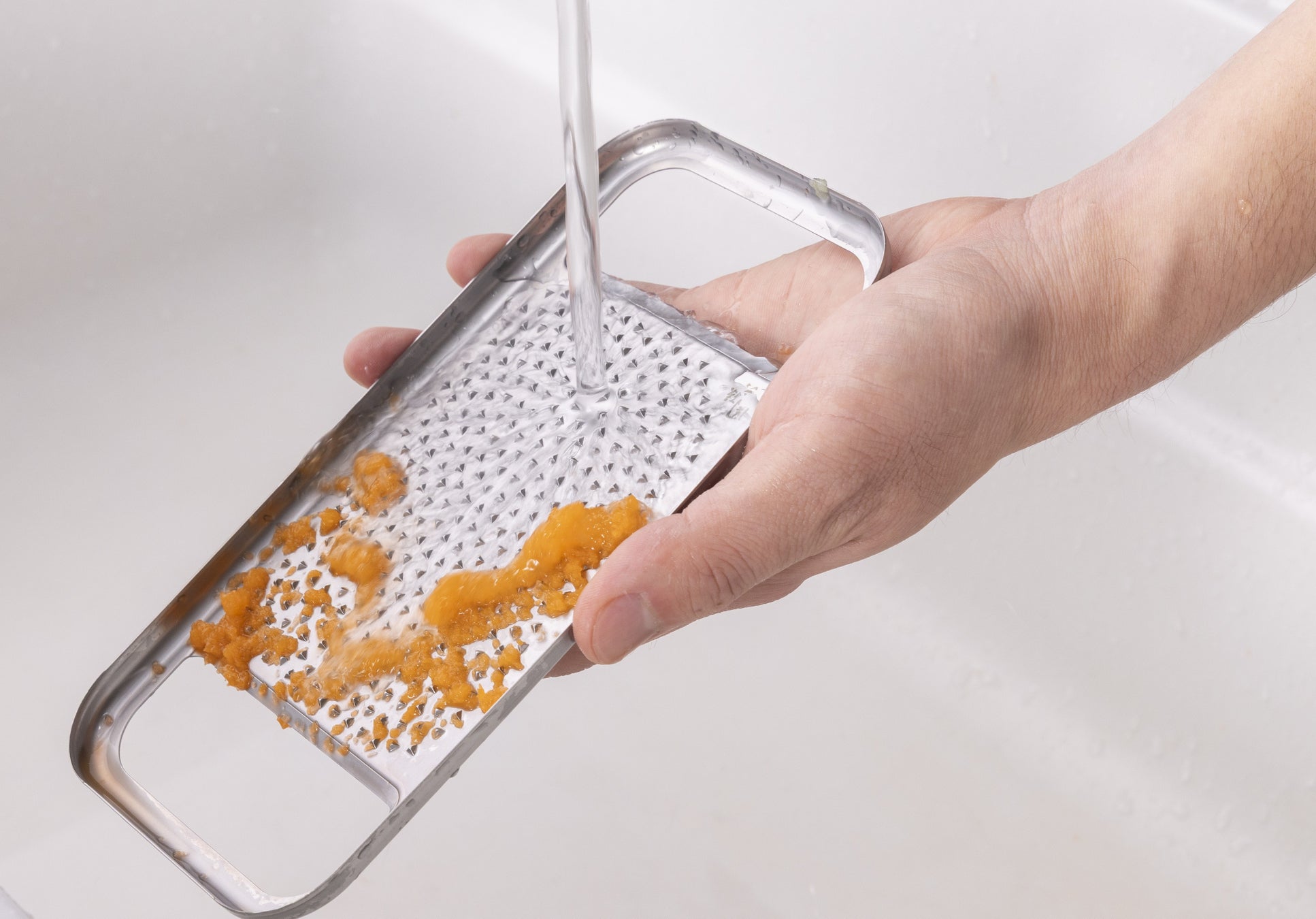 今回新しく発売した「関孫六 オールステンレス おろし器 極目立て(受け皿付き)」「関孫六 オールステンレス 薬味おろし 極目立て」は、目立ての形状と配置の工夫によって、おろしやすさと洗いやすさを両立させました。食材を軽い力でスムーズにおろせるだけでなく、使用後は水で洗い流すだけで食材を洗い落とすことができ、ストレスフリーでご使用できます。