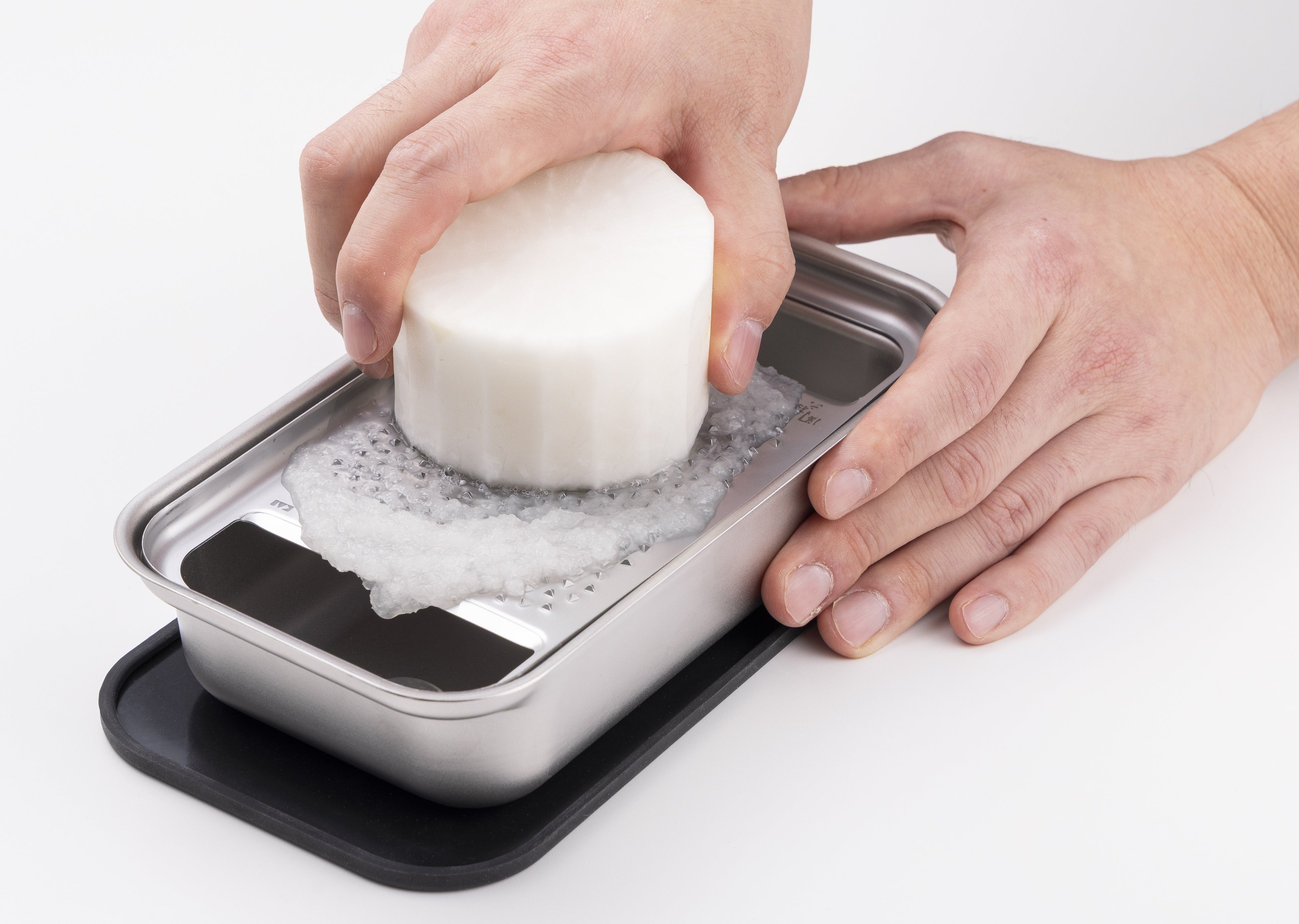 今回新しく発売した「関孫六 オールステンレス おろし器 極目立て(受け皿付き)」「関孫六 オールステンレス 薬味おろし 極目立て」は、目立ての形状と配置の工夫によって、おろしやすさと洗いやすさを両立させました。食材を軽い力でスムーズにおろせるだけでなく、使用後は水で洗い流すだけで食材を洗い落とすことができ、ストレスフリーでご使用できます。