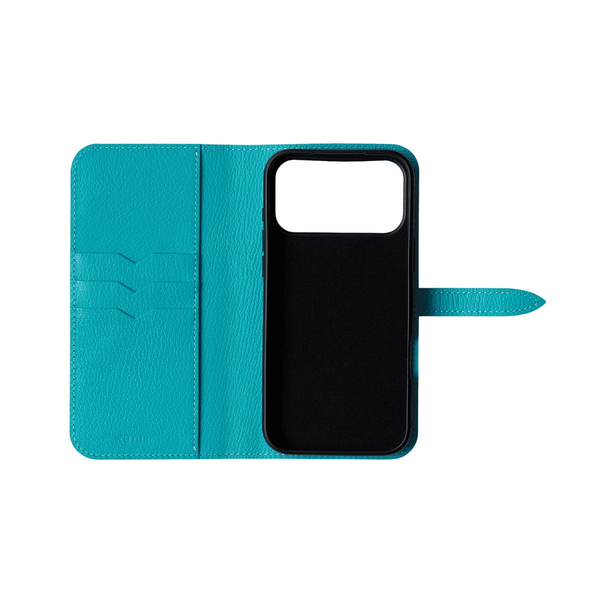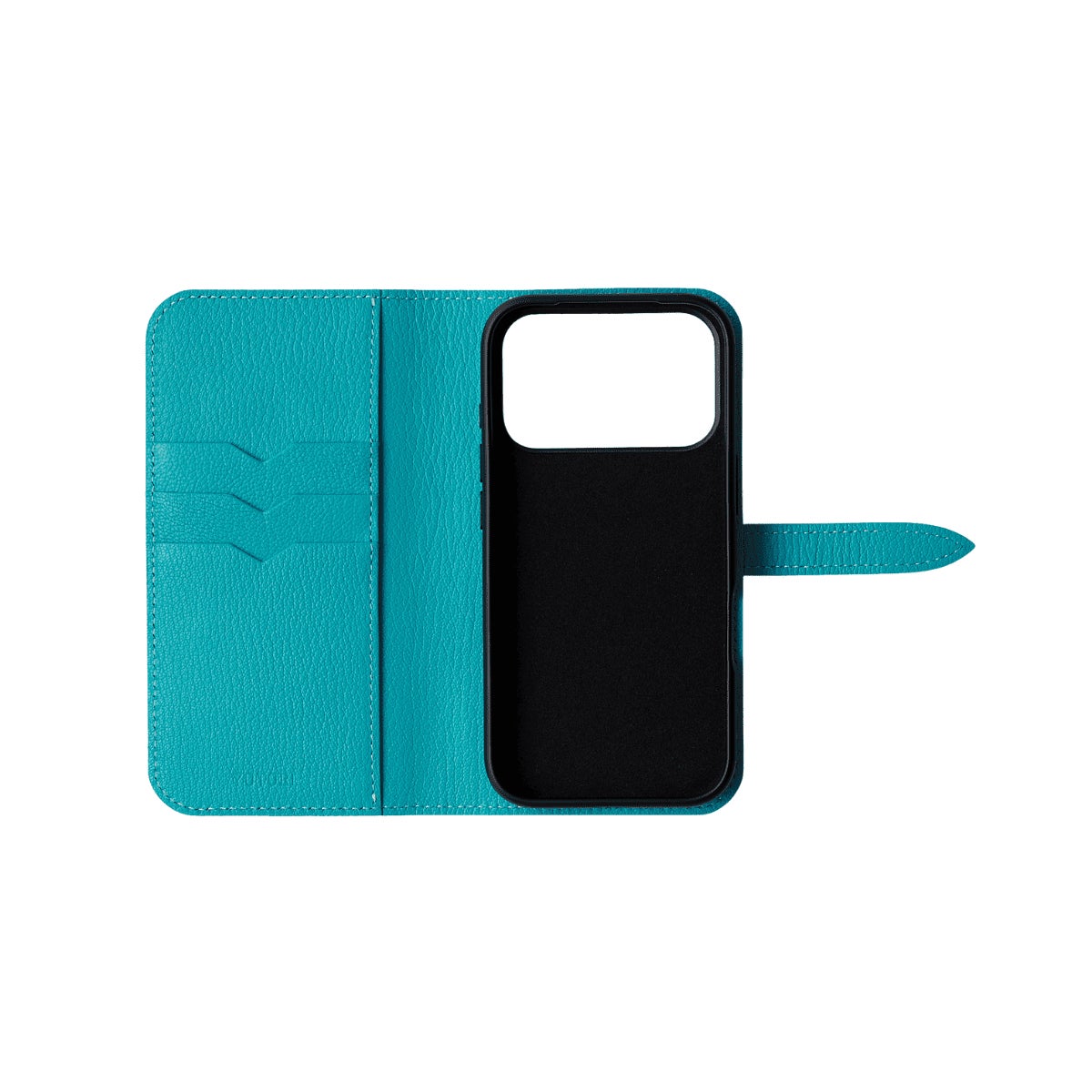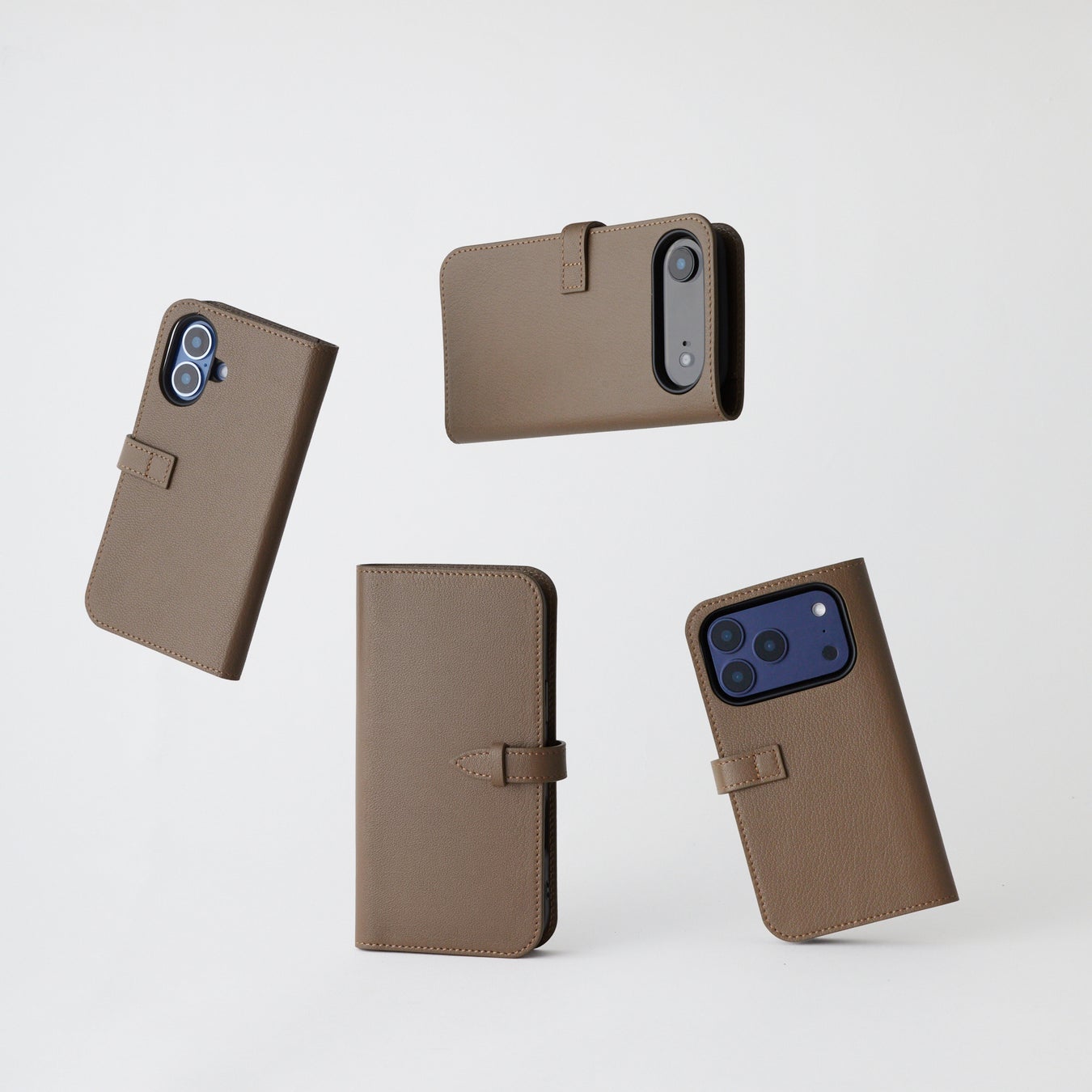 落ち着いた佇まいの手帳型iPhone用レザーケースは仕事の場でもプライベートの場でも違和感なく使用できます。