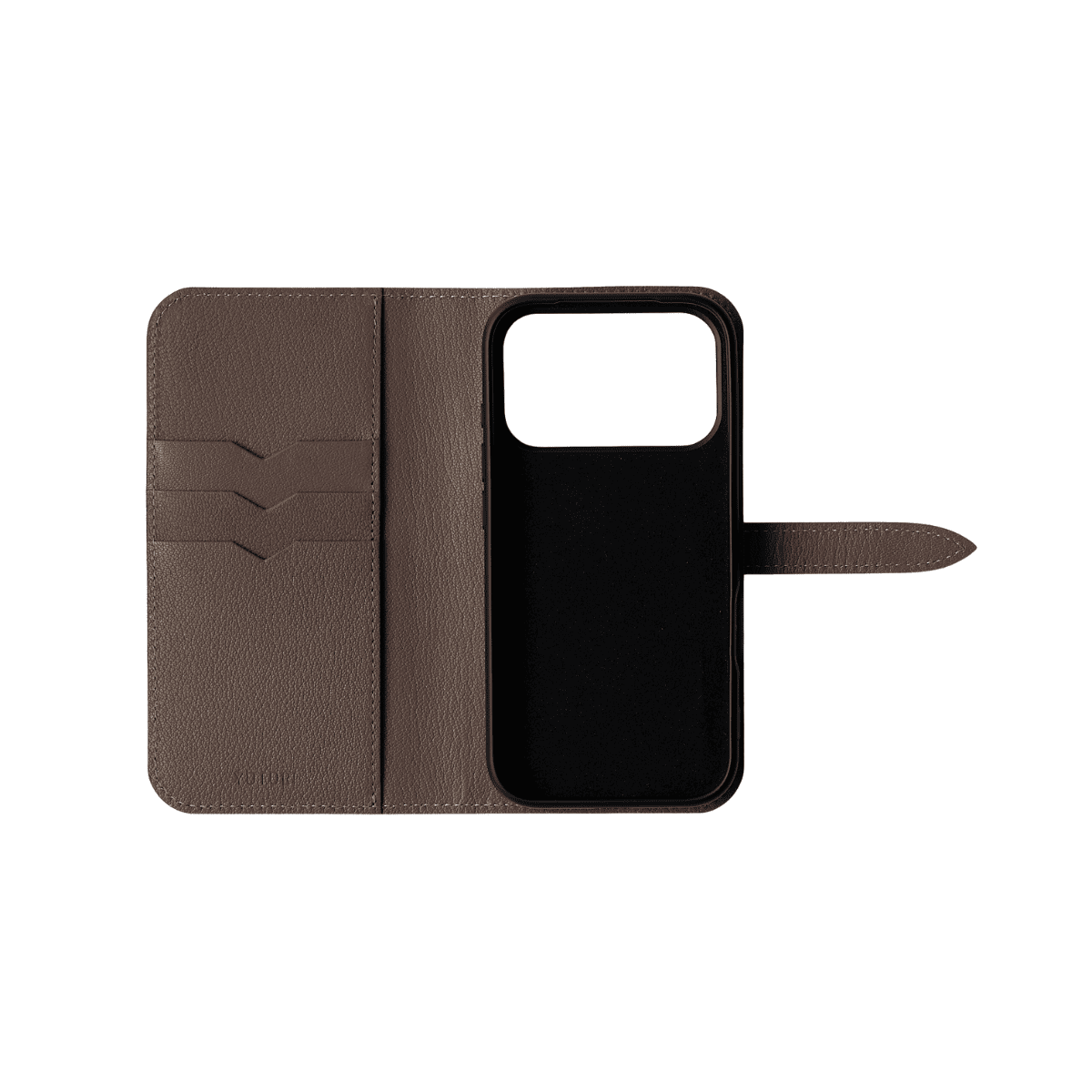 落ち着いた佇まいの手帳型iPhone用レザーケースは仕事の場でもプライベートの場でも違和感なく使用できます。