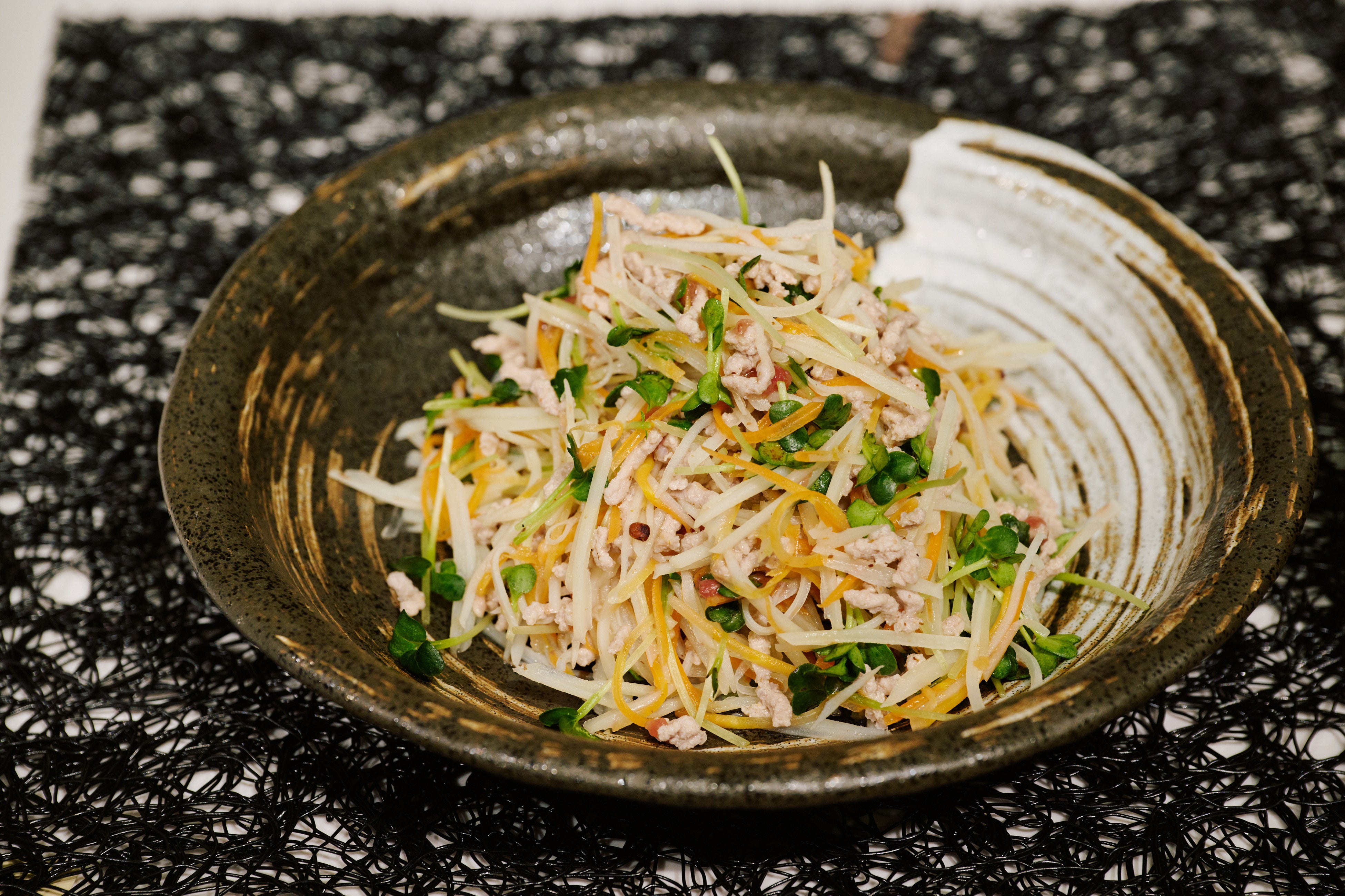 ④梅干しを叩き、白だしと野菜(①)、豚ひき肉(②)を和える。