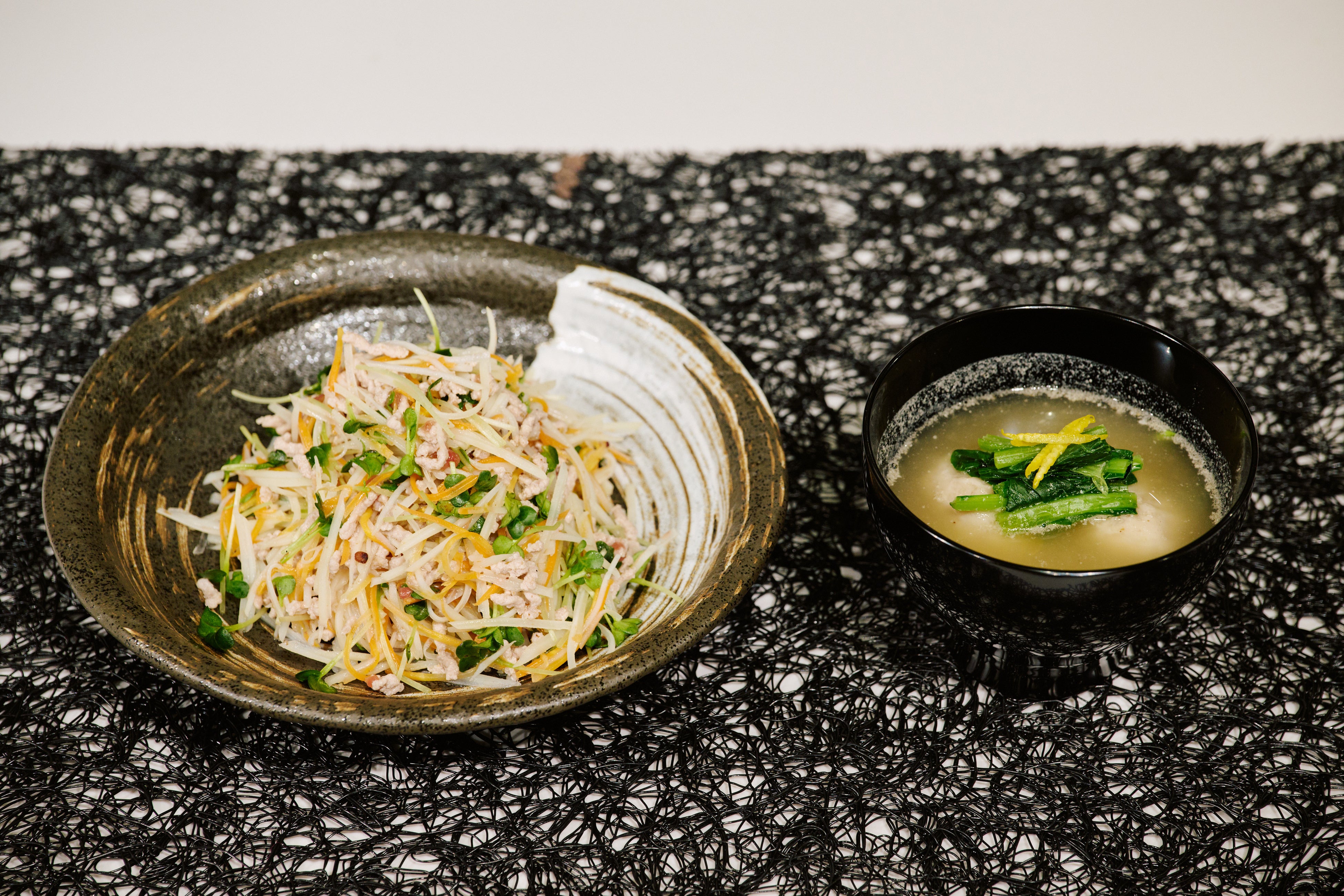 村田氏による実演では、新商品を用いて「ジャガ人参ダシ粉和え」「鶏つみれの胡麻汁」の2品を披露しました。この2品は料亭の味をご自宅で簡単再現できるレシピです。