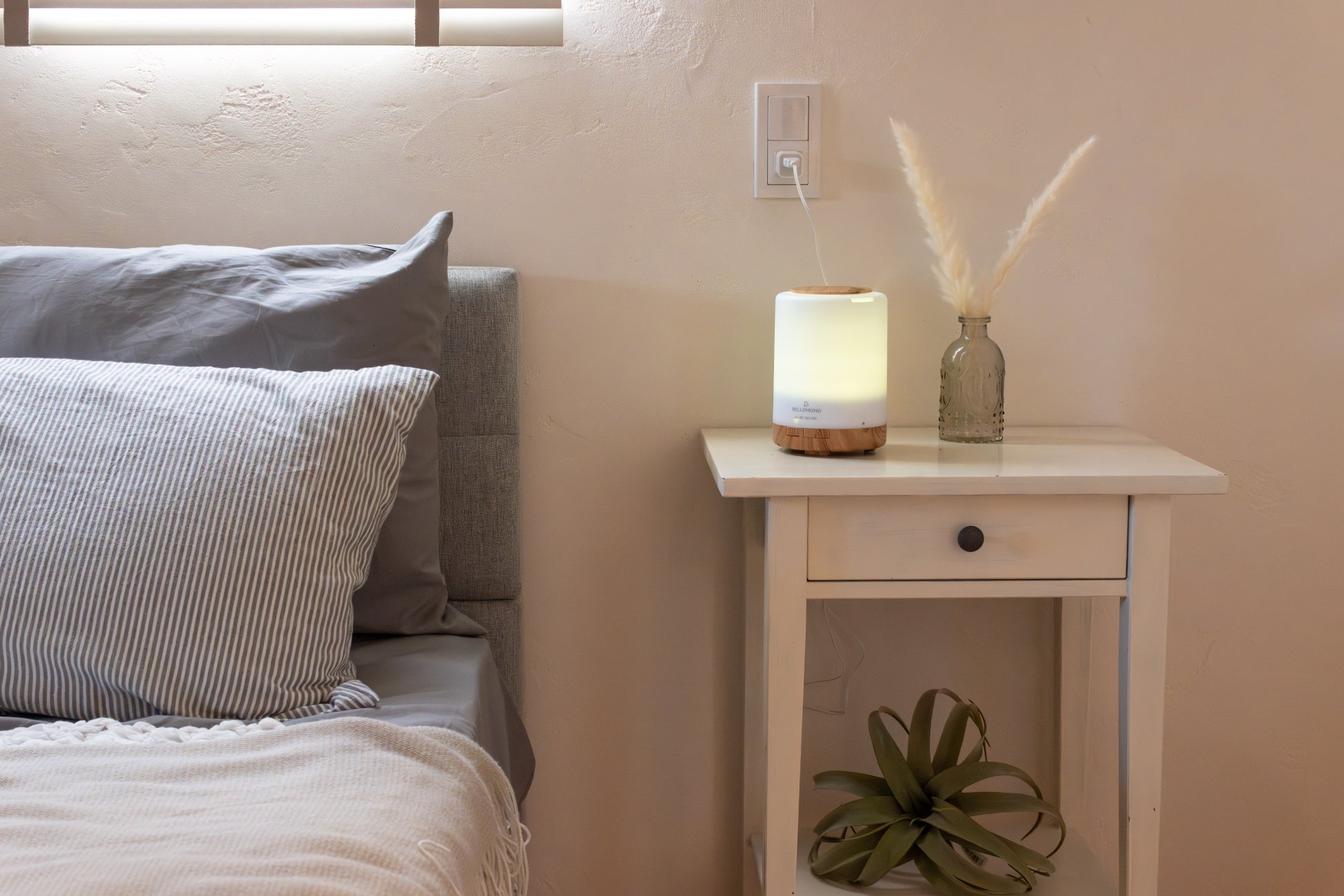 ミストは真上ではなく斜めに噴出される仕様で、香りを広げたい方向へ調整しやすい点も特長です。さらに、36dBの静音設計により、寝室やリビングなどのリラックス空間にもなじみます。