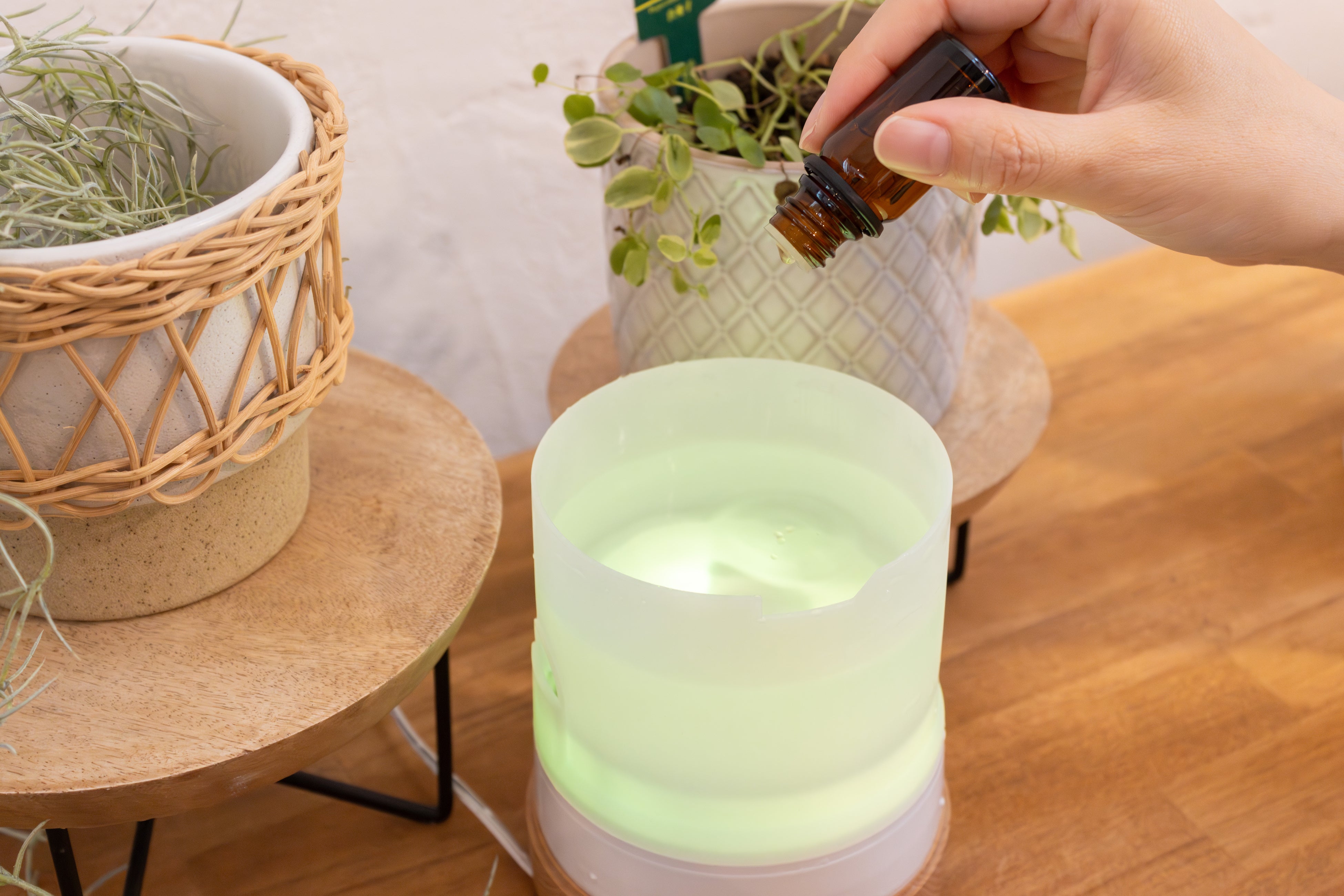 なかでも、花粉の時期に好まれる清涼感のある香り『ペパーミント』は、季節に合わせて選ばれることの多いアロマのひとつです。本製品はアロマオイルディフューザーとして、水溶性アロマオイルおよび天然抽出成分100%のエッセンシャルオイル(精油)に対応しており、季節や好みに合わせた香り選びを楽しむことができます。