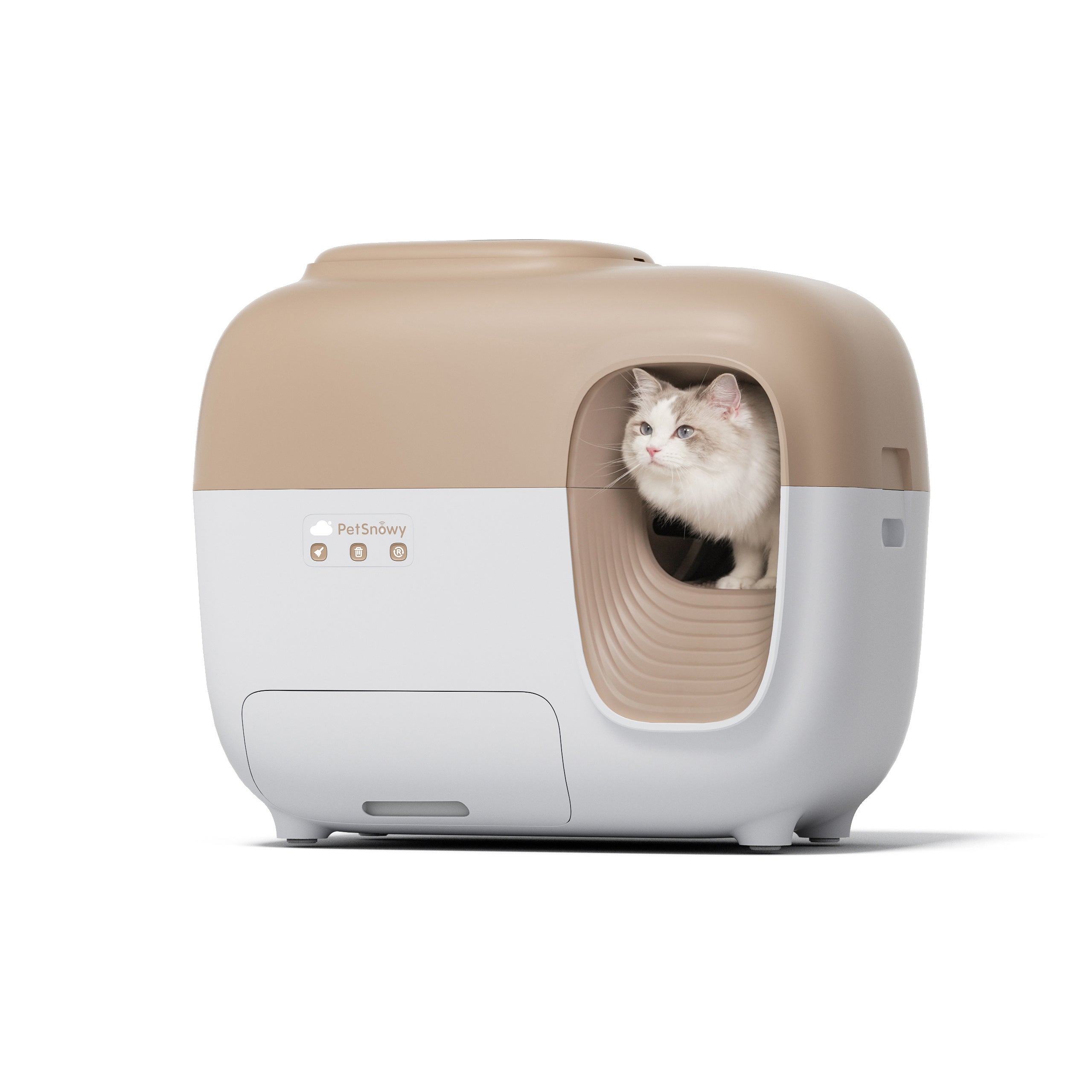 日々の猫のトイレ管理を自動化し、清潔な環境を維持。飼い主の手間を軽減するとともに、猫にとっても快適なトイレ空間を提供する全自動猫トイレです。清潔でフレッシュな空間を保つことを追求した「TiO2(二酸化チタン)光触媒」「UVライト」および「専用消臭パック」によるPetSnowy独自の三重脱臭システムを採用。毎回トイレ後に自動で掃除を開始し、トイレ掃除からゴミ袋の密封までを全自動で行います。また、独自開発の自動密封システムは、トレーを引くだけでゴミ袋を密封。ニオイの拡散を低減させると同時に、手を汚さずにごみを片付けることができます。