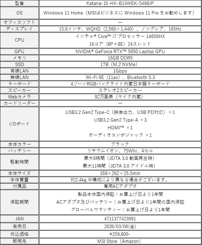 この度、エムエスアイコンピュータージャパン株式会社は、GPUに最大消費電力115W「GeForce RTX™ 5050 Laptop GPU」と性能強化型のパワフルCPU「Core™ i7 プロセッサー 14650HX」を搭載したハイスペックゲーミングノートPC「Katana-15-HX-B14WEK-5498JP」をMSI Store(Amazon)にて2026年3月6日(金)より順次販売開始 いたします。