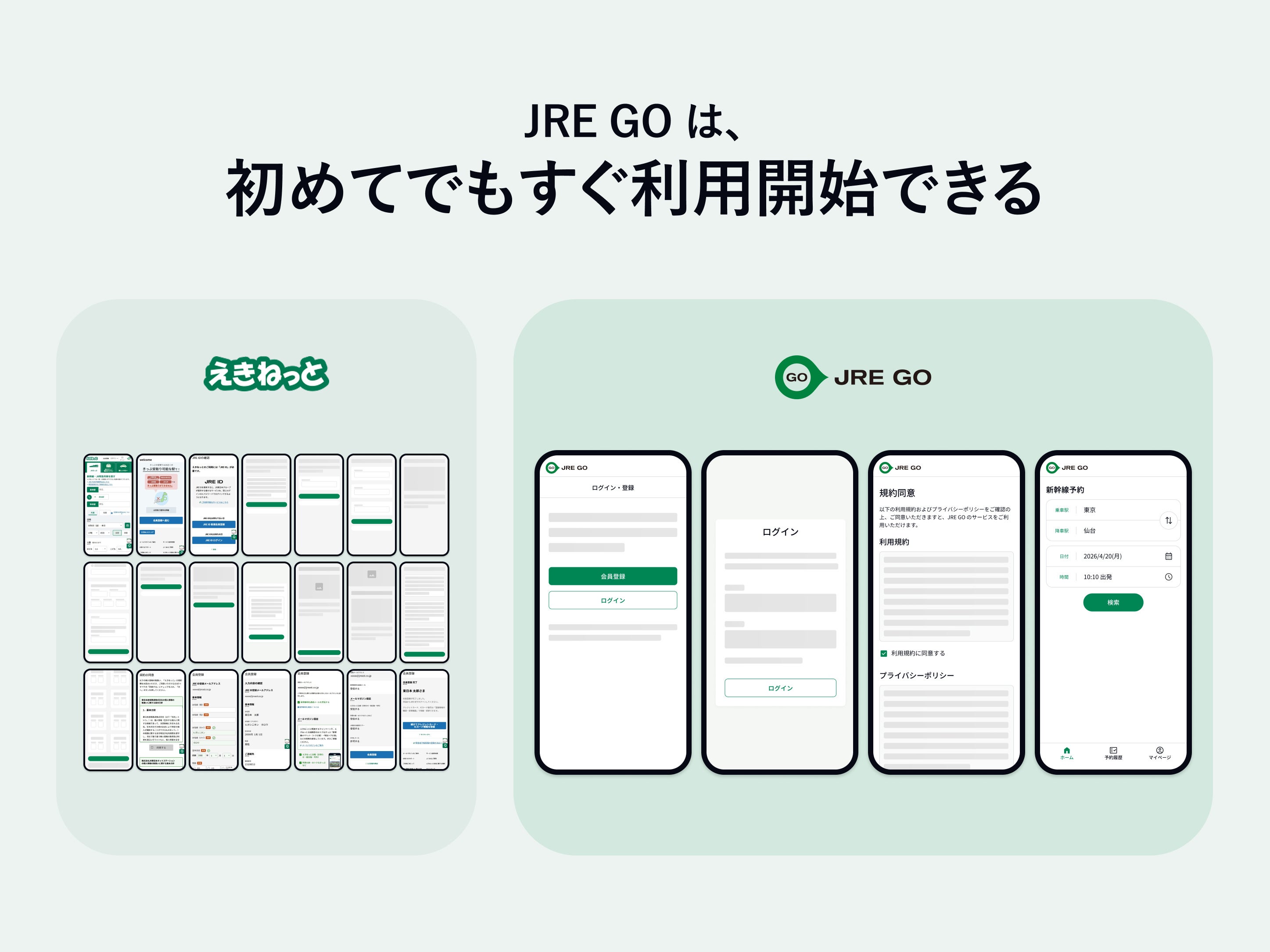 「えきねっと」は1,000万人を超えるお客さまにご利用いただいています。しかし2001年のサービス開始以来、「会員登録に時間がかかる」「列車の比較に手間がかかる」「直前の予約変更が難しい」「サイトの操作が重く(遅く)感じる」といった、改善を求めるご意見を数多く頂戴してきました。そこで、これらのご意見に応えるべく、全く新しい発想のもと、お客さまのニーズに即応することを目指す新しい予約サービス、JRE GOをスタートさせます。