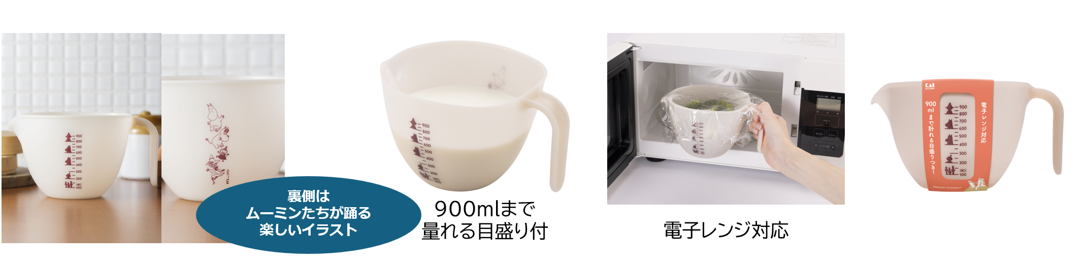 計る、混ぜるがひとつでできる計量ボウル。両面にムーミンモチーフがあしらわれていて、900mlまで計量できます。