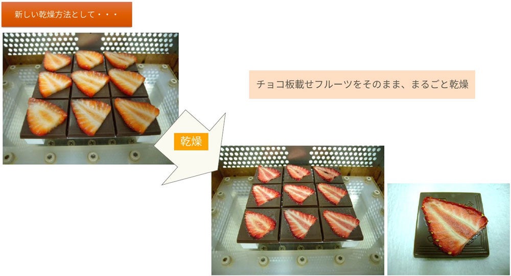 減圧乾燥と熱風乾燥のサンプルの比較およびチョコ板載せフルーツの丸ごと乾燥サンプル展示