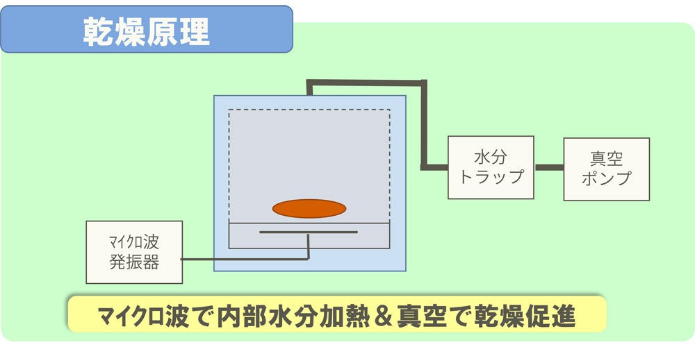 シャープが現在、研究開発に取り組んでいるのが、「高品位減圧乾燥技術」です。食品や素材を真空(減圧)にしながら、マイクロ波で内部からやさしく加熱し、水分を効率よく取り除く技術です。低温で乾燥しやすいため、色・香り・栄養・食感を保ちやすく、乾燥時間の短縮も期待できます。また、表面からではなく内部から温めるため、乾きムラや縮みが起こりにくく、仕上がりが均一になりやすい点もポイントです。