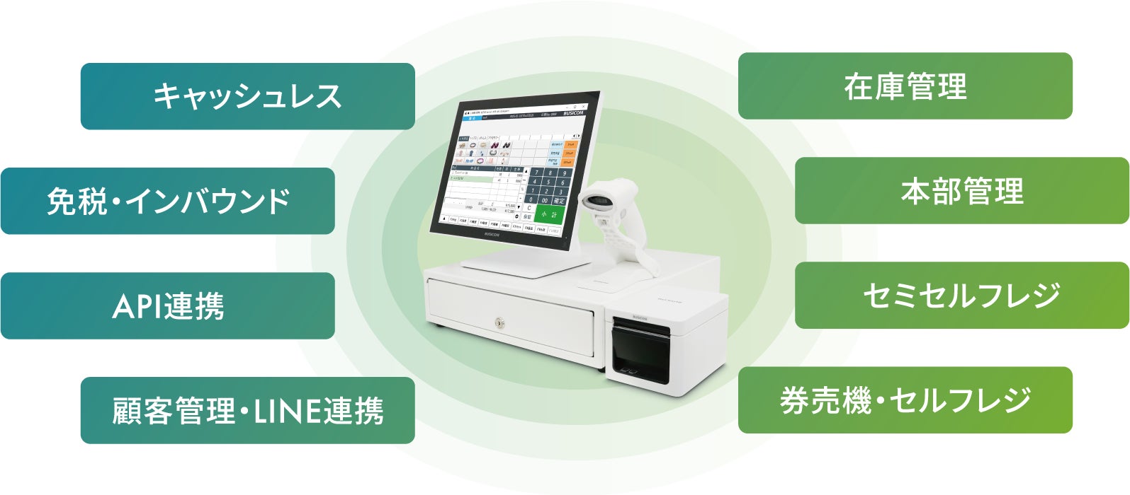 POSシステム「BCPOS」を中心に、小型POSレジ「リアレジ」やスマホ会員証アプリ「みせめぐ」など、多彩な店舗ソリューションを展示。大型店から小規模店まで、業種・運営スタイル・ご予算に応じた最適な構成をご提案します。