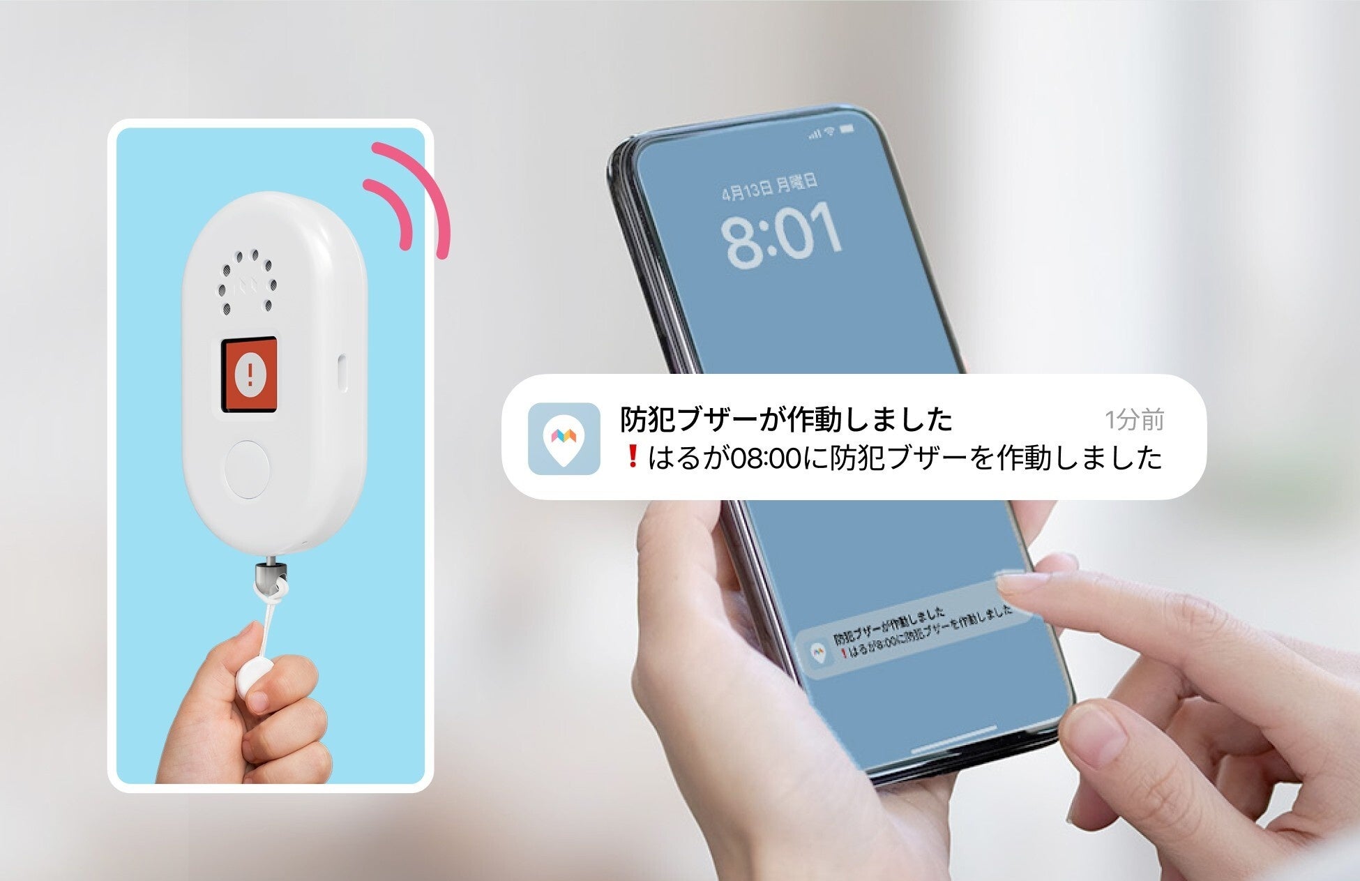 ブザーのストラップを引くと、大音量のブザー音とともに、保護者のスマートフォンへSOS通知と現在地情報が即座に届きます。