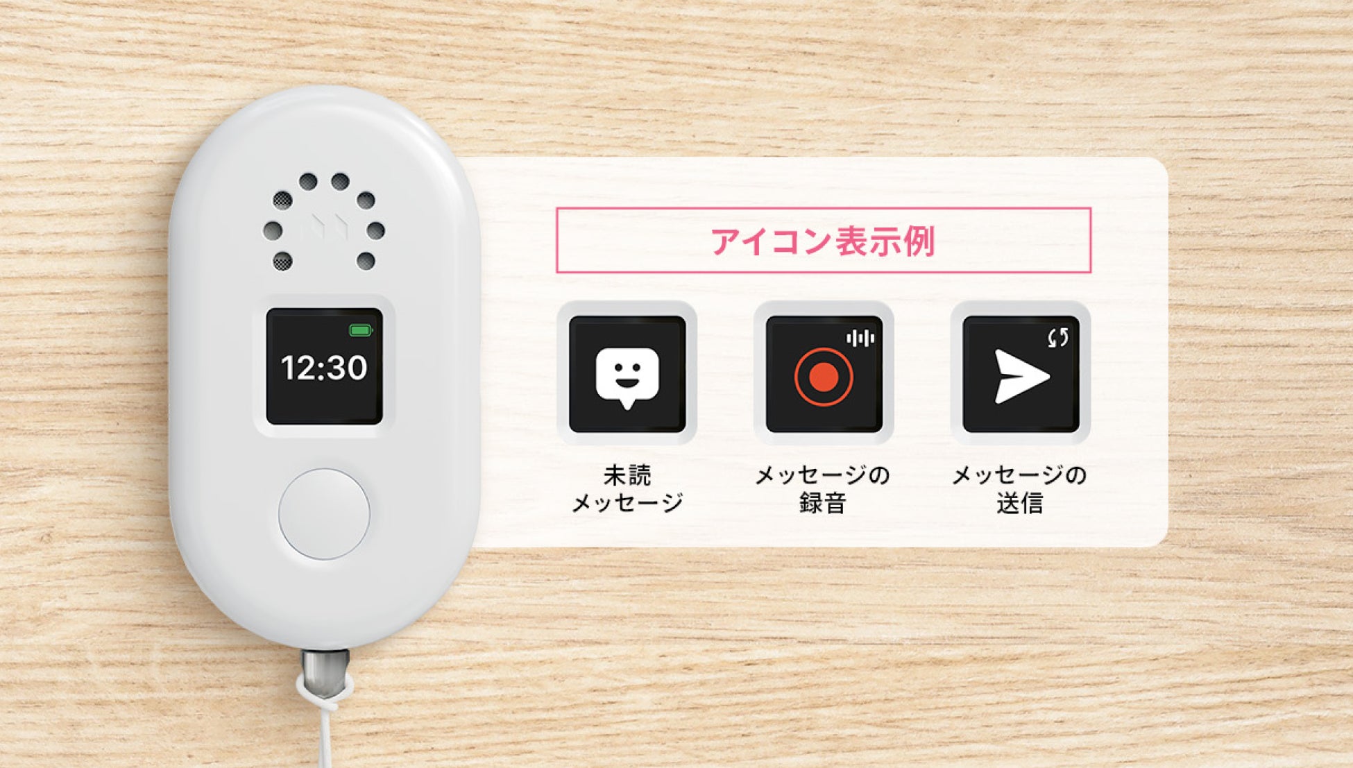 新たに搭載したディスプレイで、バッテリー残量や現在時刻、保護者からのメッセージ着信の有無を一目で確認できます。