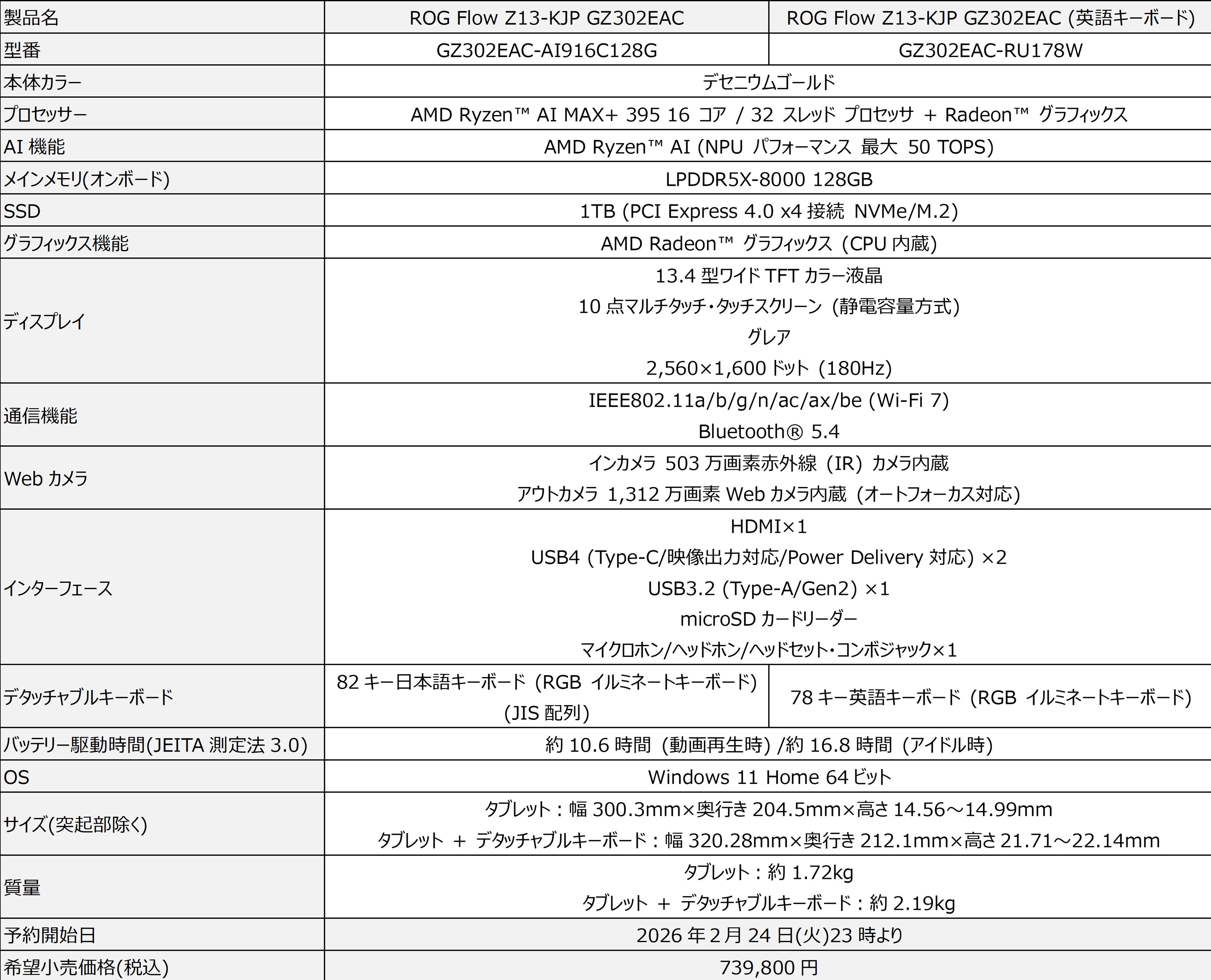 ※今回発表のROG Flow Z13-KJP GZ302EACの詳細スペックはこちらからご確認ください。