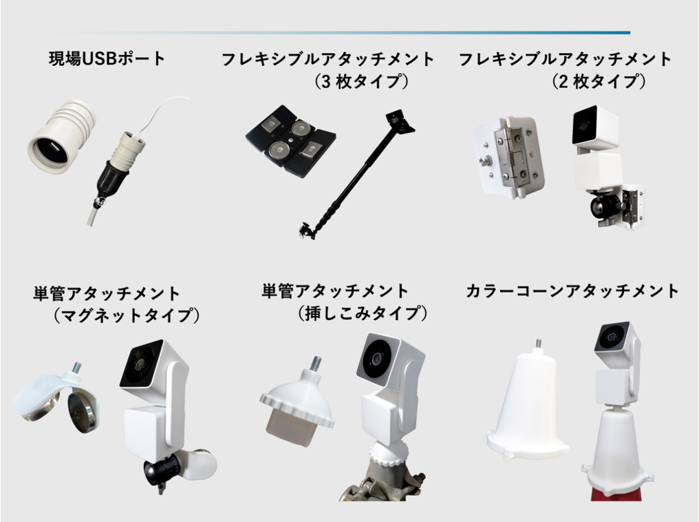 また、施工フェーズによって変化する建築現場を想定し、天井空の吊り下げや単管パイプ、カラーコーンなどの建設資材に特殊な工具不要で簡単に取り付けできる「ソラカメ 建設現場向けアタッチメント」を用いたカメラの取り付け例もご紹介します。