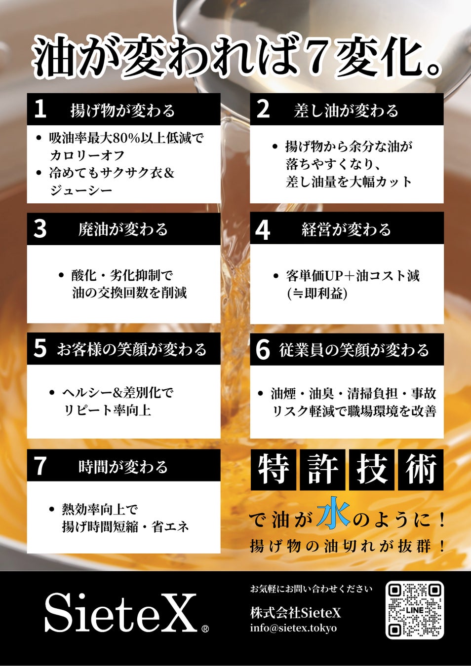 調査でも明らかになった消費者の忌避要因(油の劣化、不衛生、におい、ベチャつき)の解決に寄与します。SieteXの微弱振動共鳴共振波の技術を使った吸油率の低減効果により、「冷めてもおいしく、ベチャつかない」「胃もたれしない」といった口コミが広がり、リピート率向上につながる可能性があります。