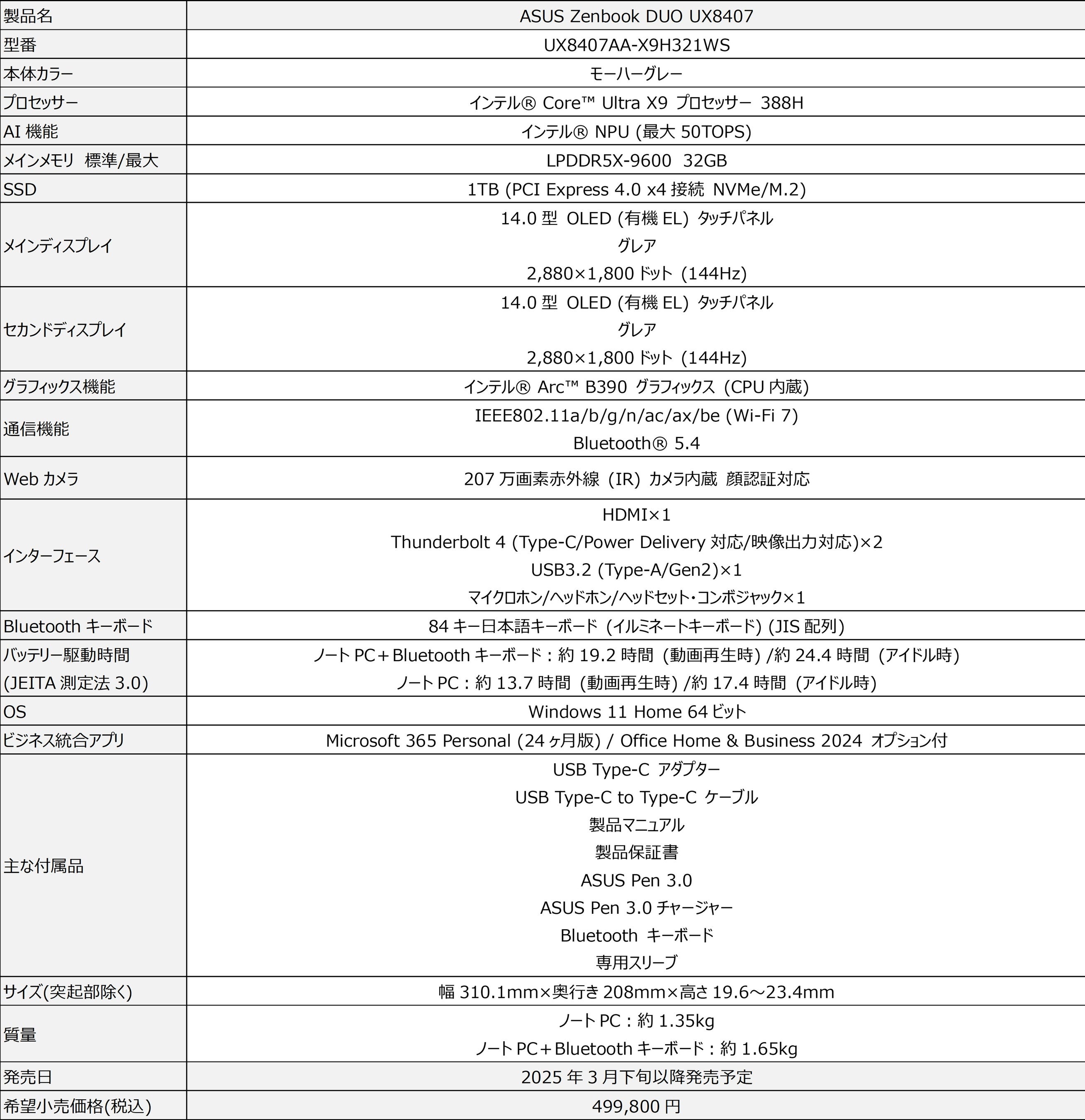 ※今回発表のASUS Zenbook DUO UX8407AAの詳細スペックはこちらからご確認ください。