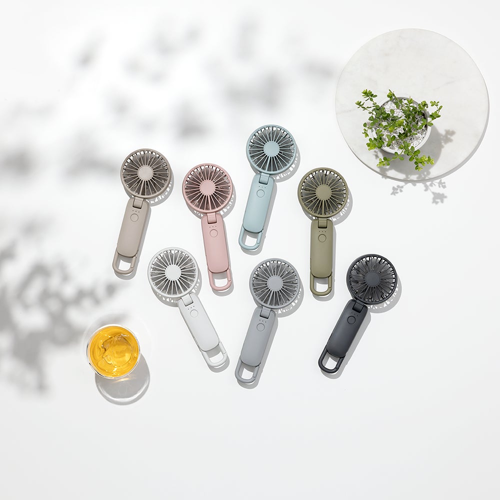 クリップ部が360度回転し、さまざまな方向にハンディファンを固定する事が可能なため、ファンの向きを狙った所に合わせる事ができます。ずれにくい構造で、ベビーカーやペットカート、テーブル、家具の縁など、さまざまな場所に取り付けて使用できます。ベビーカーやペットカート使用時に両手がふさがってしまう場面や、置き場に困る場面でも、位置を固定してハンズフリーで風に当たることができます。テーブルの上がものでいっぱいになる作業中や食事中は、テーブル縁に取り付けて、入浴後やメイク中に洗面所の棚やポールに取り付けて。屋内外を問わず、使用シーンは無限大です。