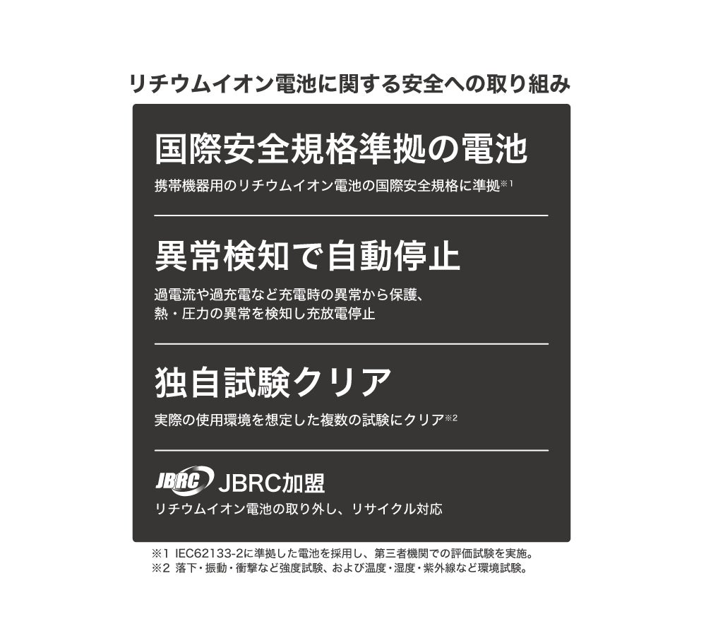 従来通り、内蔵しているリチウムイオン電池は国際規格(IEC62133-2)に準拠したリチウムイオン電池を採用し、各種保護回路による安全制御設計と独自の信頼性試験を実施。一般社団法人JBRC加盟企業として、リサイクルにも取り組んでいます。