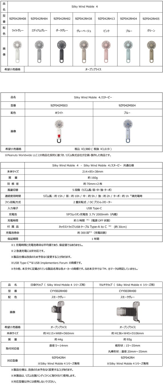リズム株式会社(取締役社長 湯本武夫)は、近年大変ご好評いただいている、2重反転ファンで大風量のハンディーファンSilky Wind Mobileシリーズの最新モデル「Silky Wind Mobile 4(シルキーウインドモバイル4)」と「Silky Wind Mobile 4/スヌーピー」、また専用オプション品として「日傘クリップ(Silky Wind Mobile 4シリーズ用)」、「マルチクリップ(Silky Wind Mobile 4シリーズ用)」を、3月上旬より順次発売いたします。